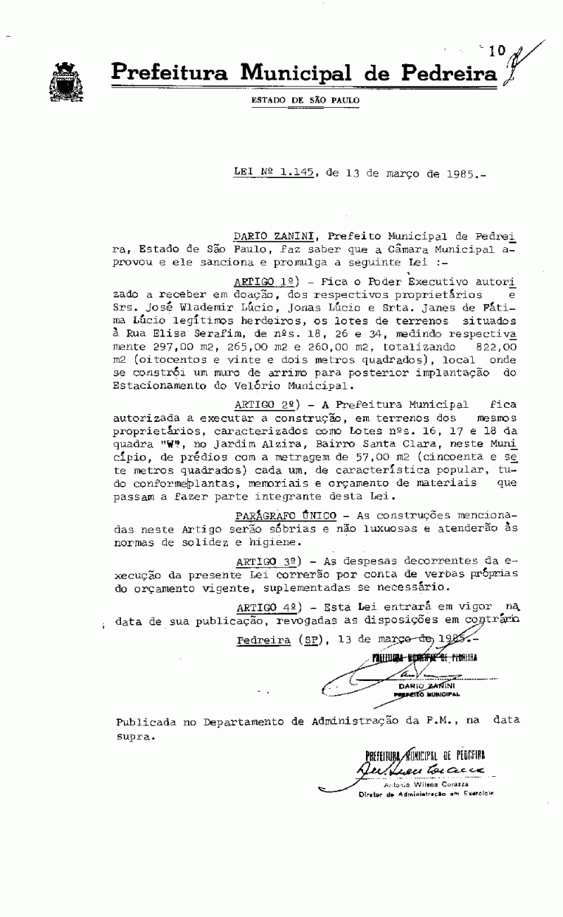 Lei Municipal - N° 1145 de 13/03/1985