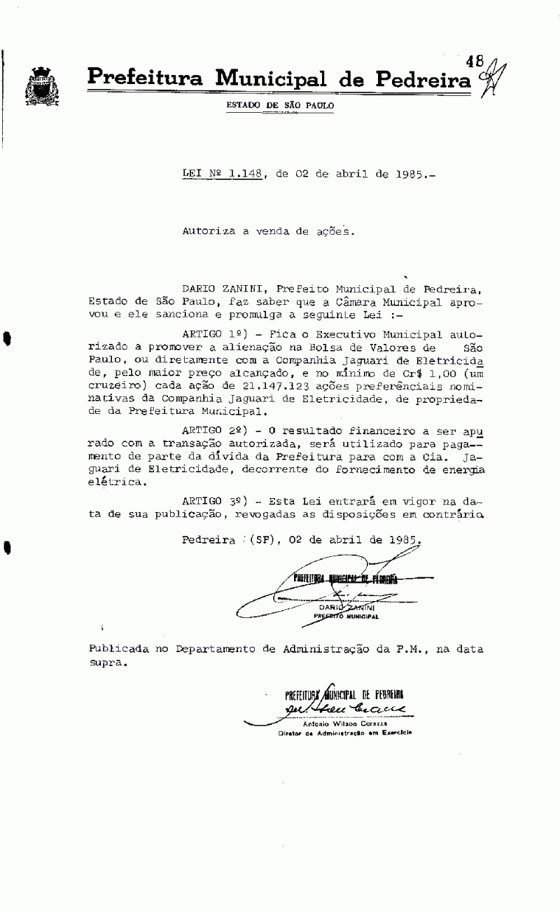 Lei Municipal - N° 1148 de 02/04/1985