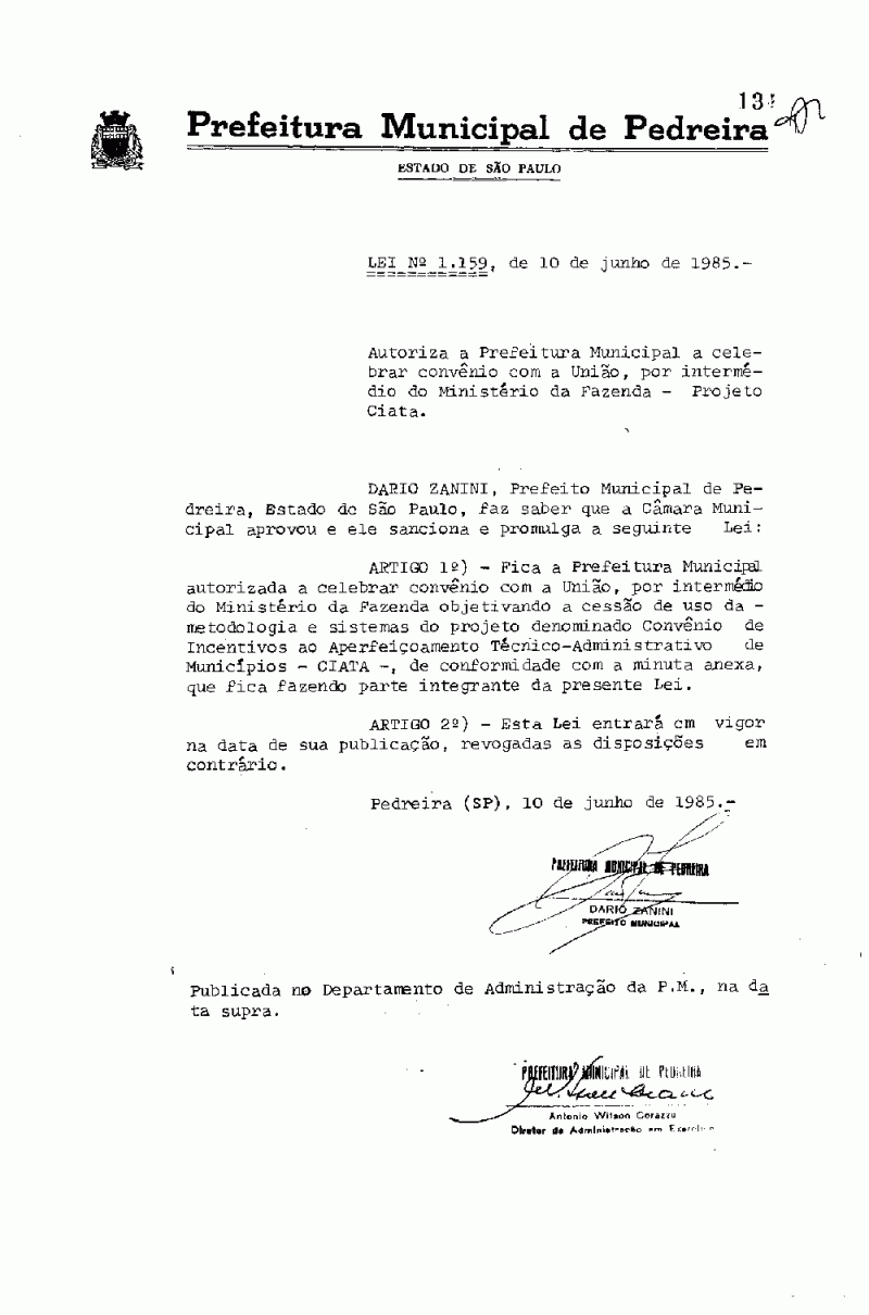 Ementa: Autoriza a Prefeitura Municipal a celebrar convênio com a União, por intermédio do Ministério da Fazenda - Projeto Ciata.