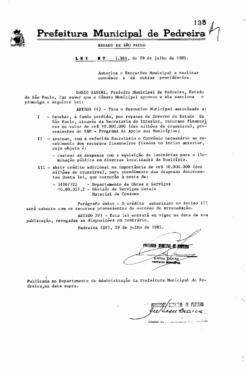 Lei Municipal - N° 1161 de 29/07/1985