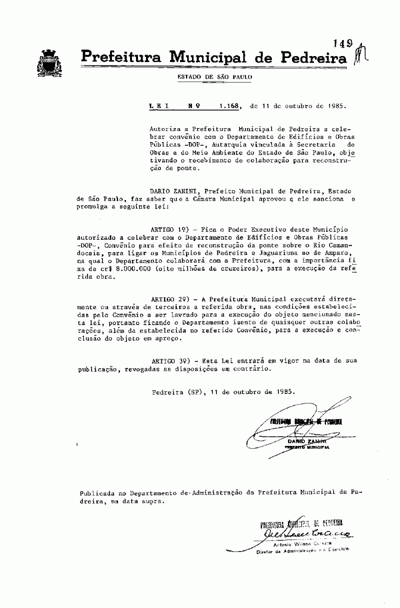 Lei Municipal - N° 1168 de 11/10/1985