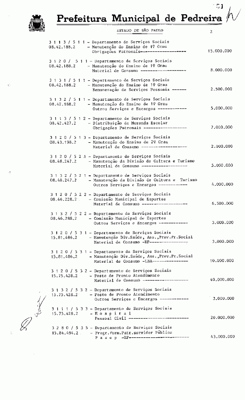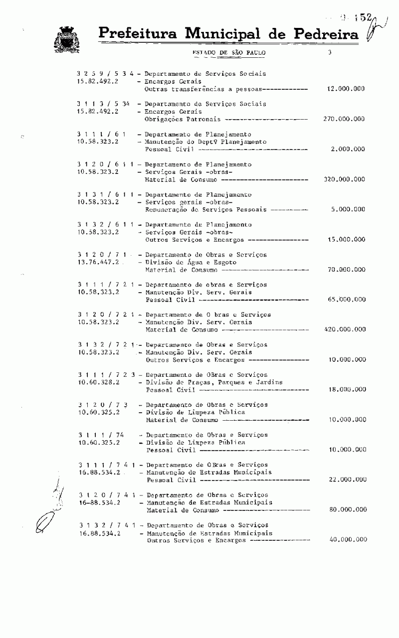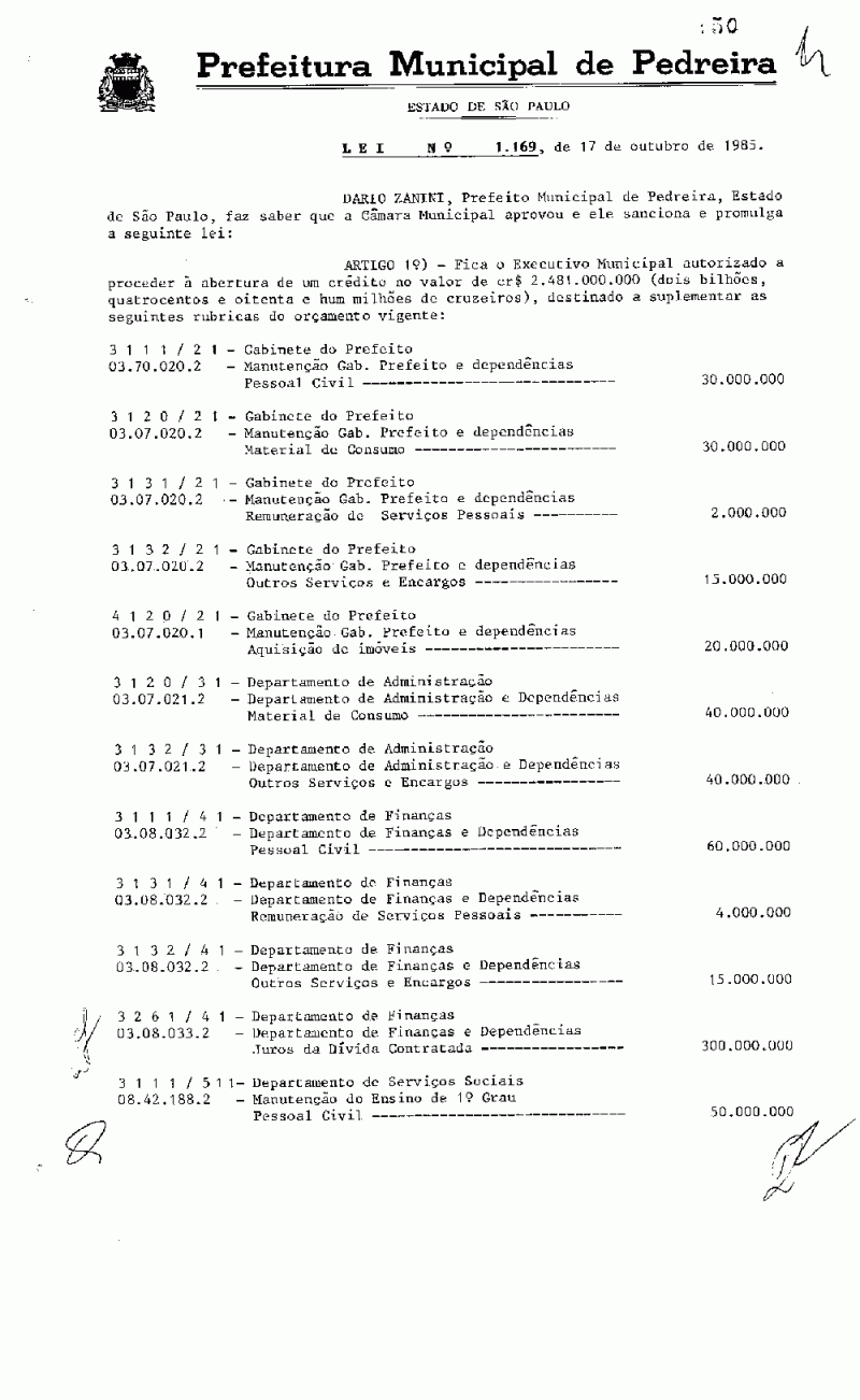 Ementa: Artigo 1º - Fica o Executivo Municipal autorizado a proceder à abertura de um crédito no valor de Cr$ 2.481.000.000 (dois bilhões, quatrocentos e oitenta e hum milhões de cruzeiros), destinado a suplementar as seguintes rubricas do orçamento vigente.