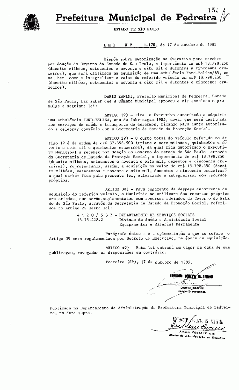 Ementa: Dispõe sobre autorização ao Executivo para receber por doação do Governo do Estado de São Paulo, a importância de Cr$ 18.798.250 (dezoito milhões, setecentos e noventa e oito mil, duzentos e cinquenta cruzeiros), que será utilizada na aquisição de uma ambulância Ford-Belina/85, nova, bem como integralizar o valor do referido veículo em Cr$ 18.798.250 (dezoito milhões, setecentos e noventa e oito mil, duzentos e cinquenta cruzeiros).