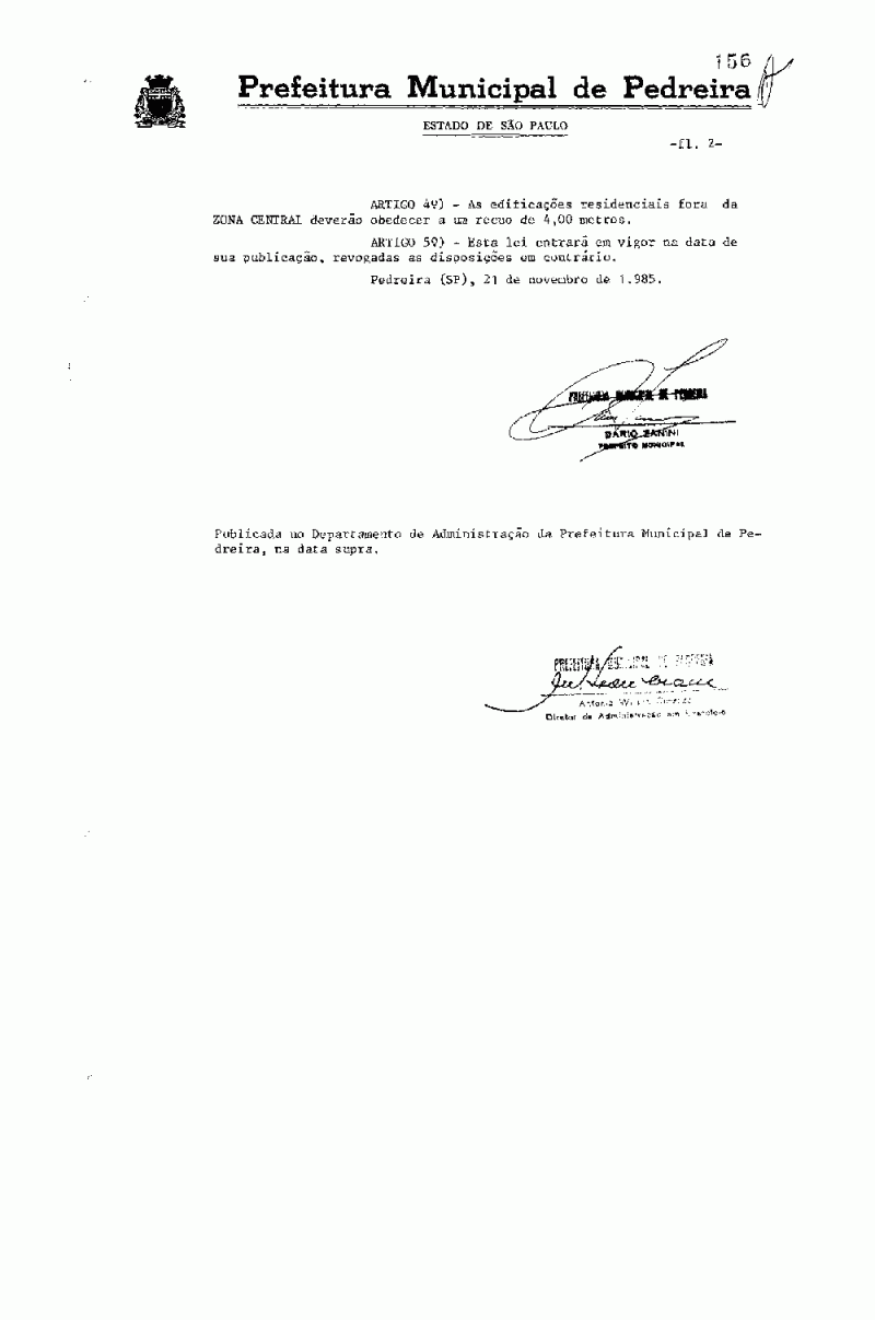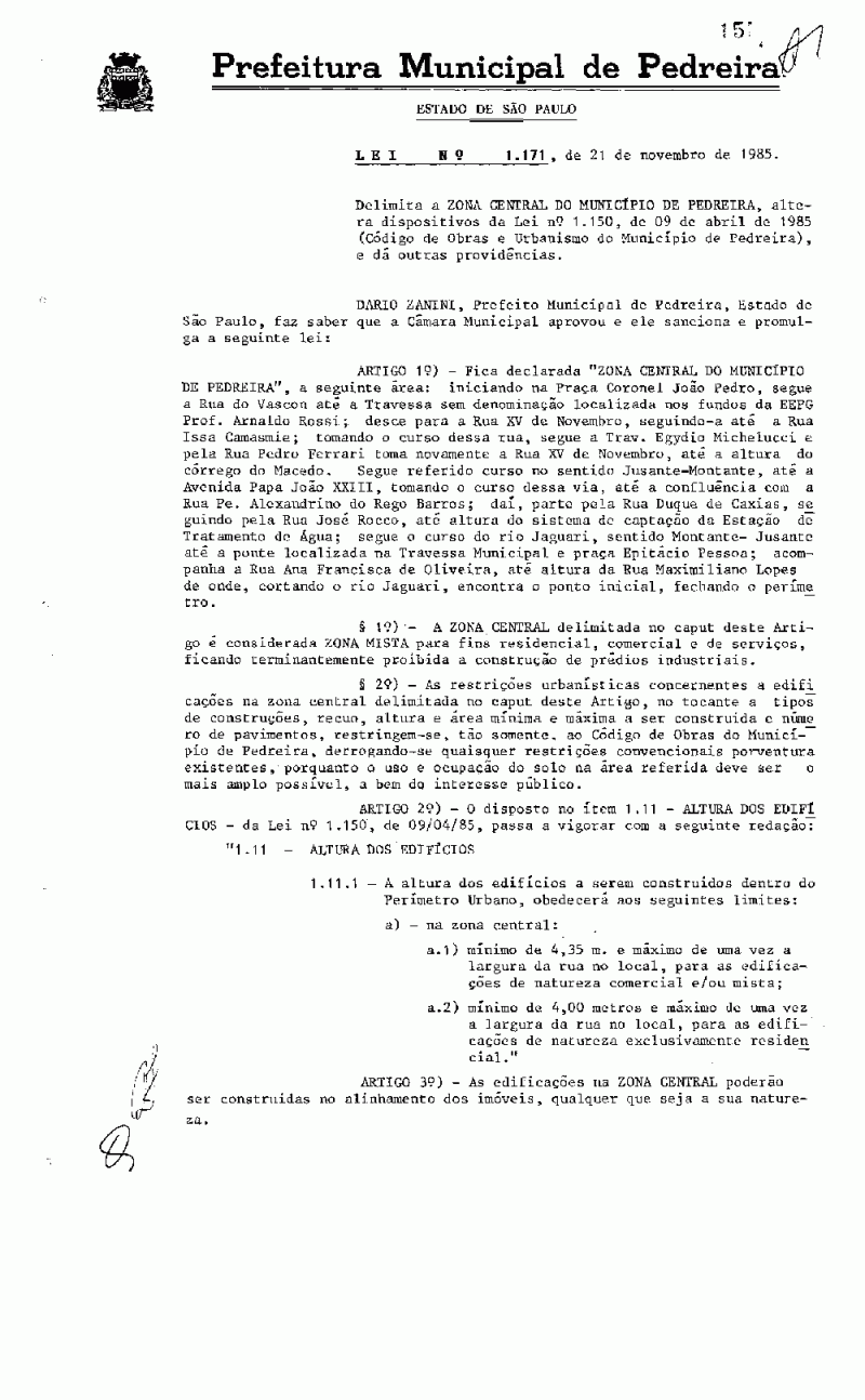 Ementa: Delimita a Zona Central do Município de Pedreira, altera dispositivos da Lei nº 1150, de 09 de abril de 1985 (Código de Obras e Urbanismo do Município de Pedreira), e dá outras providências.