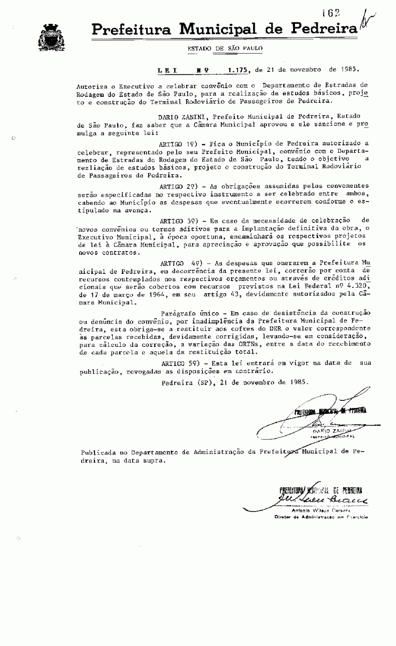 Ementa: Autoriza o Executivo a celebrar convênio com o Departamento de Estradas de Rodagem do Estado de São Paulo, para a realização de estudos básicos, projeto e construção do Terminal Rodoviário de Passageiros de Pedreira.