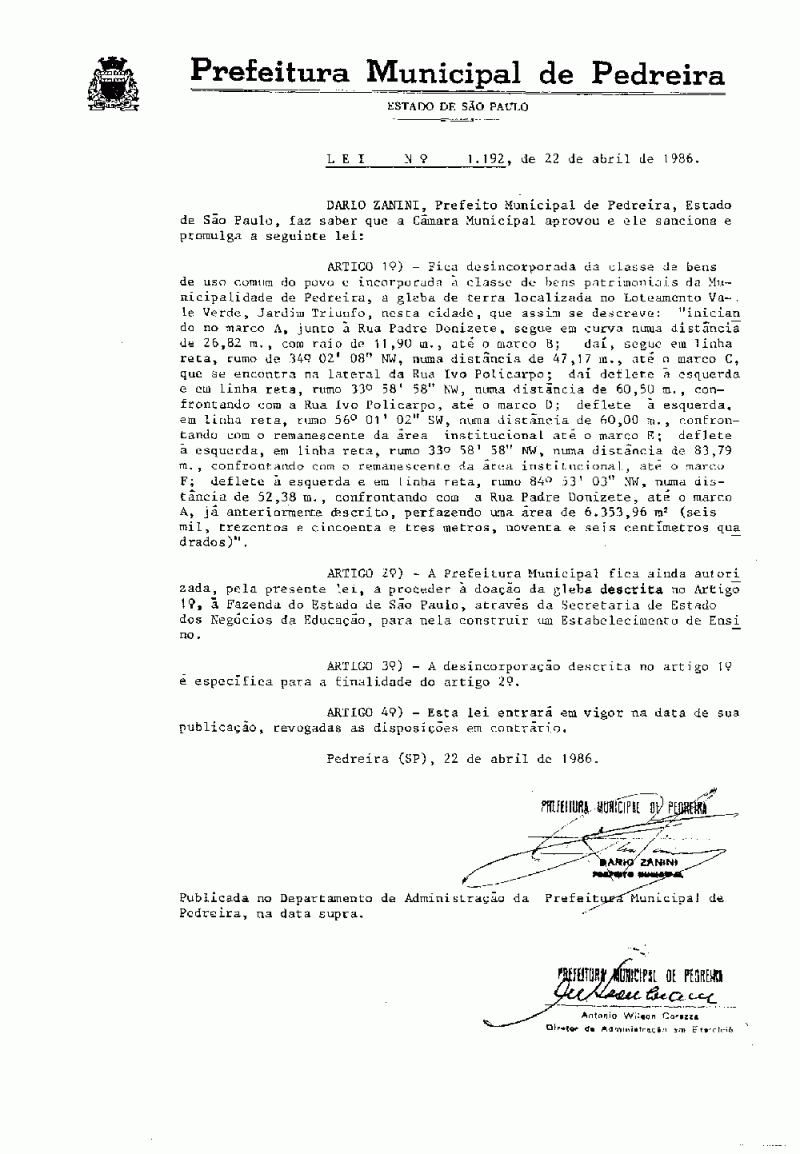 Ementa: Artigo 1º - Fica desincorporada da classe de bens de uso comum do povo e incorporada à classe de bens patrimoniais da Municipalidade de Pedreira, a gleba de terra localizada no Loteamento Vale Verde, Jardim Triunfo, nesta cidade, que assim se descreve.