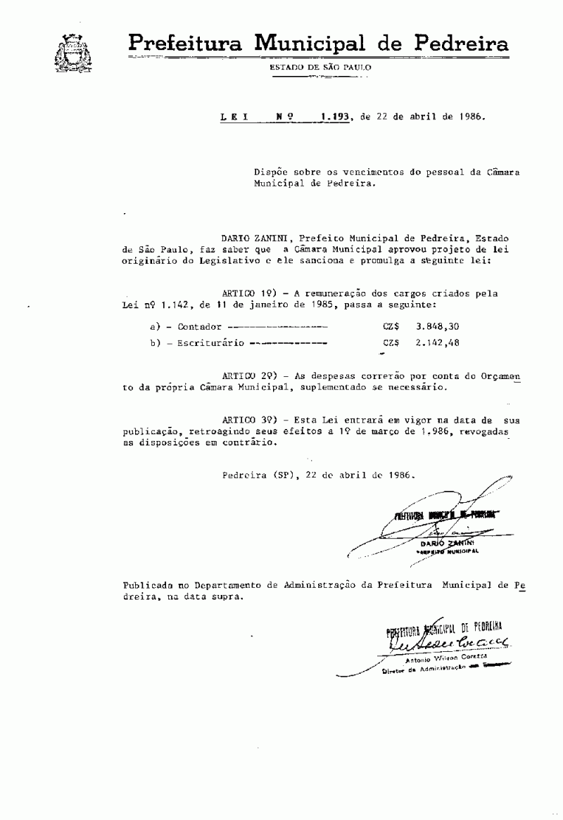 Ementa: Dispõe sobre os vencimentos do pessoal da Câmara Municipal de Pedreira.