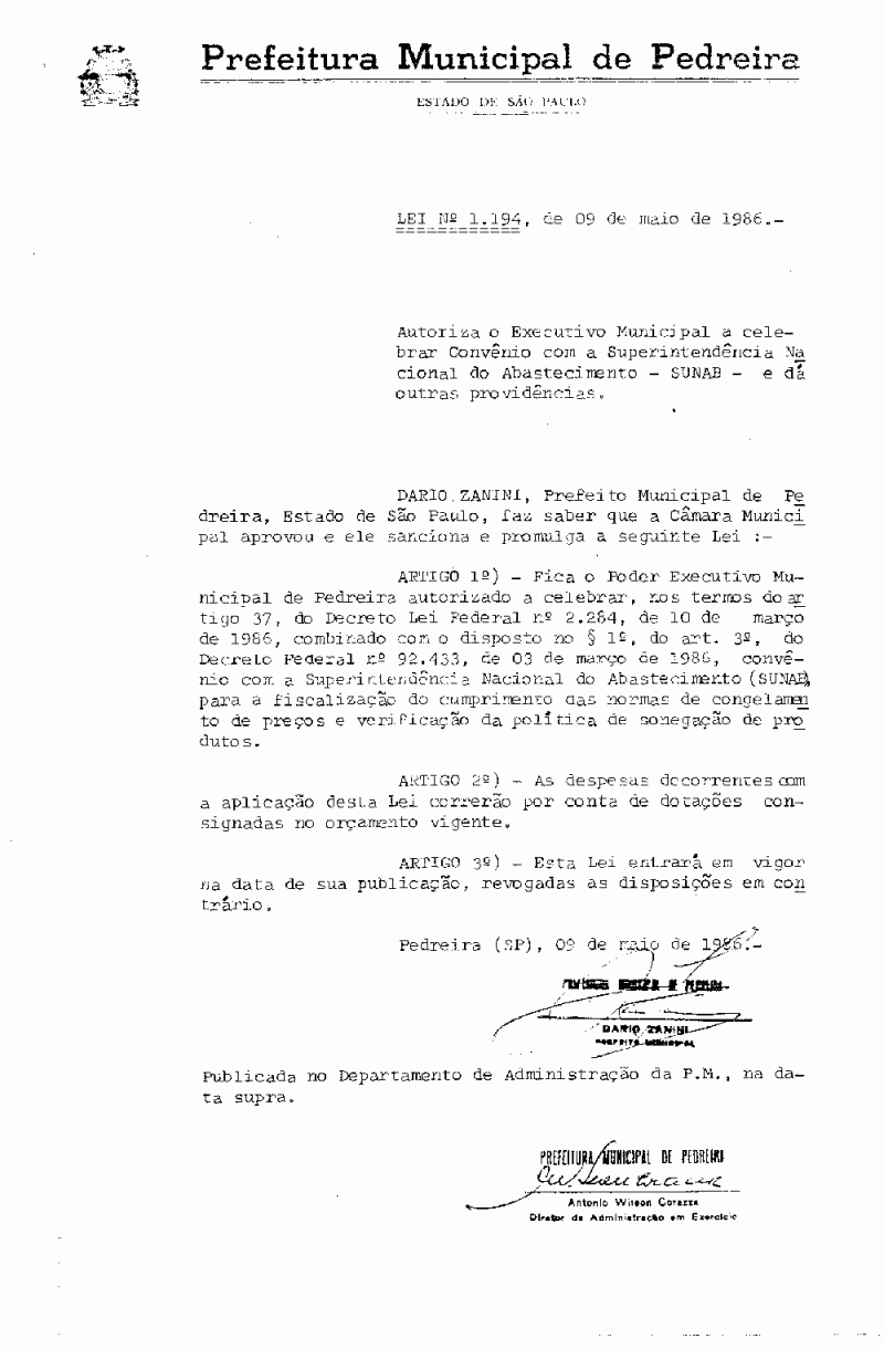 Lei Municipal - N° 1194 de 09/05/1986