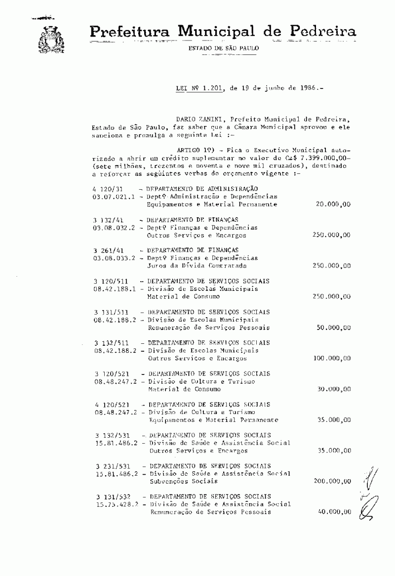 Lei Municipal - N° 1201 de 19/06/1986
