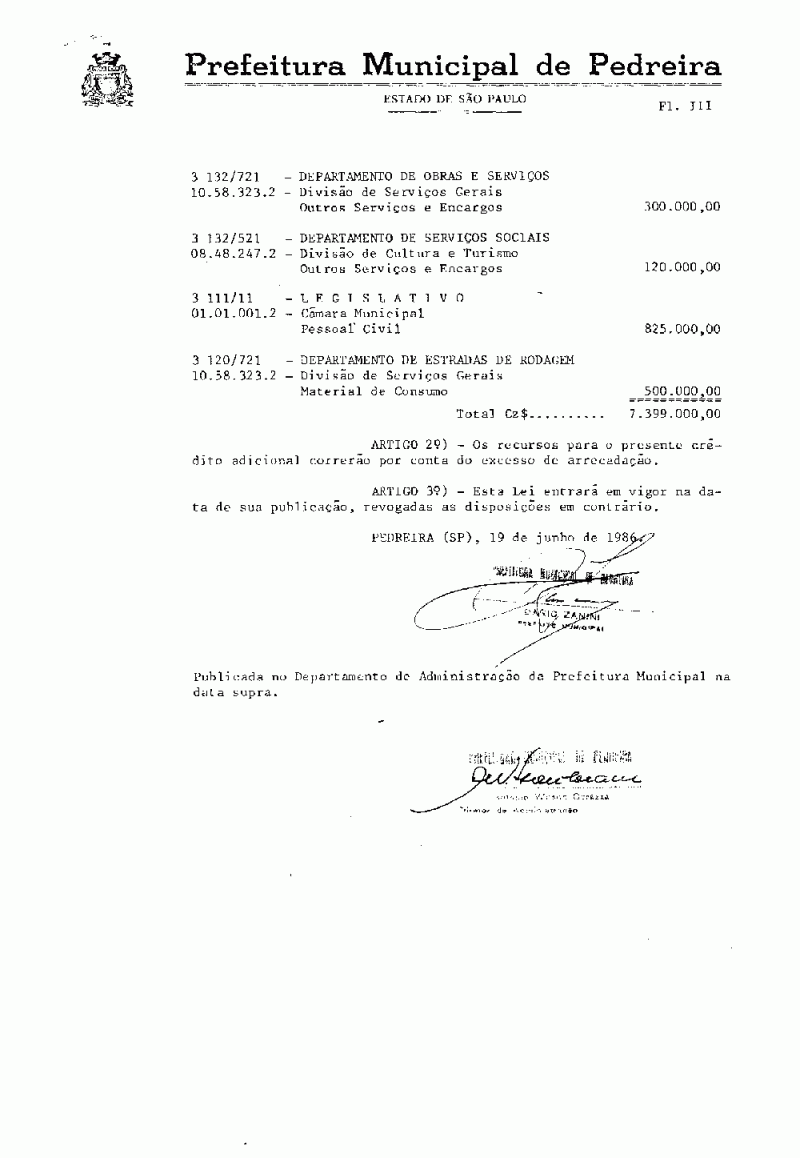 Ementa: Artigo 1º - Fica o Executivo Municipal autorizado a abrir um crédito suplementar no valor de Cz$ 7.399.000,00 (sete milhões, trezentos e noventa e nove mil cruzados), destinado a reforçar as seguintes verbas do orçamento vigente.