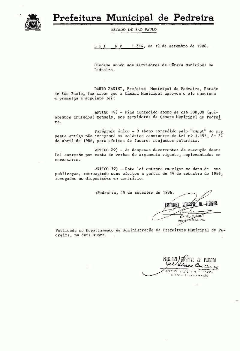 Ementa: Concede abono aos servidores da Câmara Municipal de Pedreira.