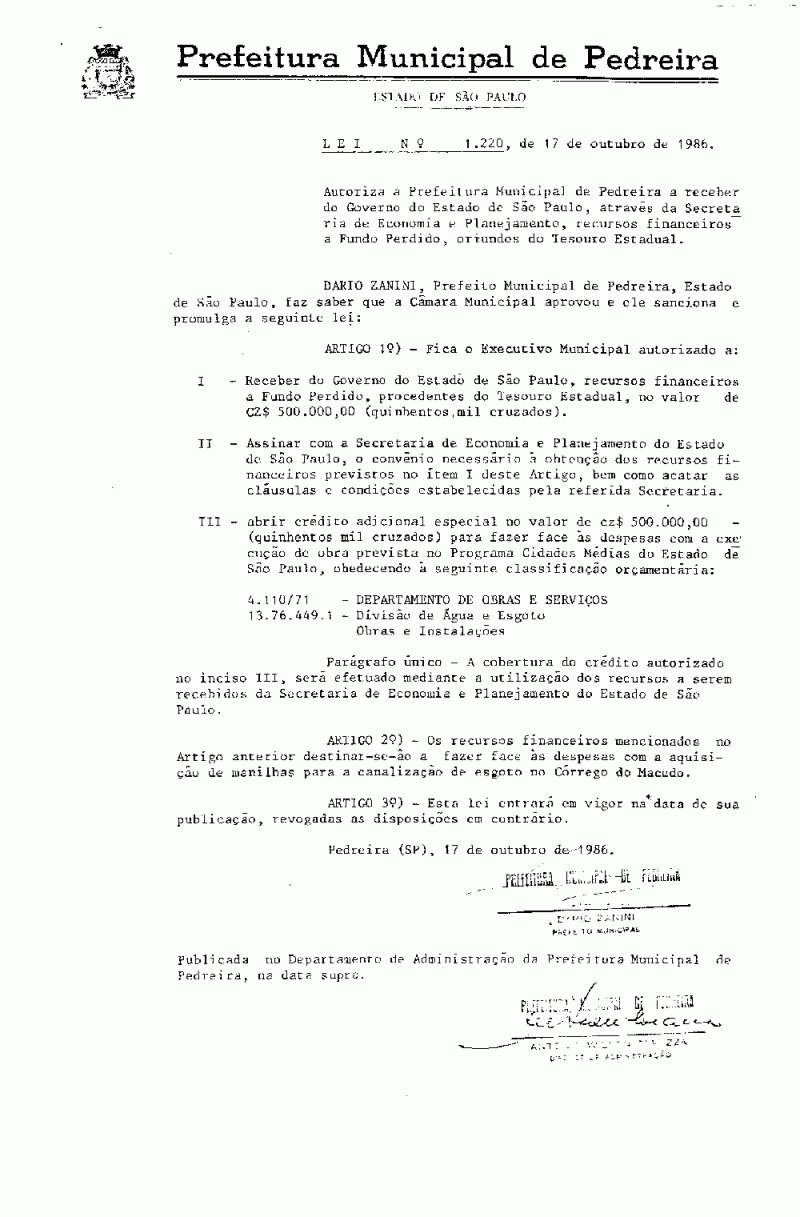 Ementa: Autoriza a Prefeitura Municipal de Pedreira a receber do Governo do Estado de São Paulo, através da Secretaria de Economia e Planejamento, recursos financeiros a Fundo Perdido, oriundos do Tesouro Nacional.