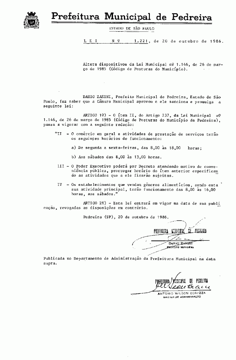 Lei Municipal - N° 1221 de 20/10/1986