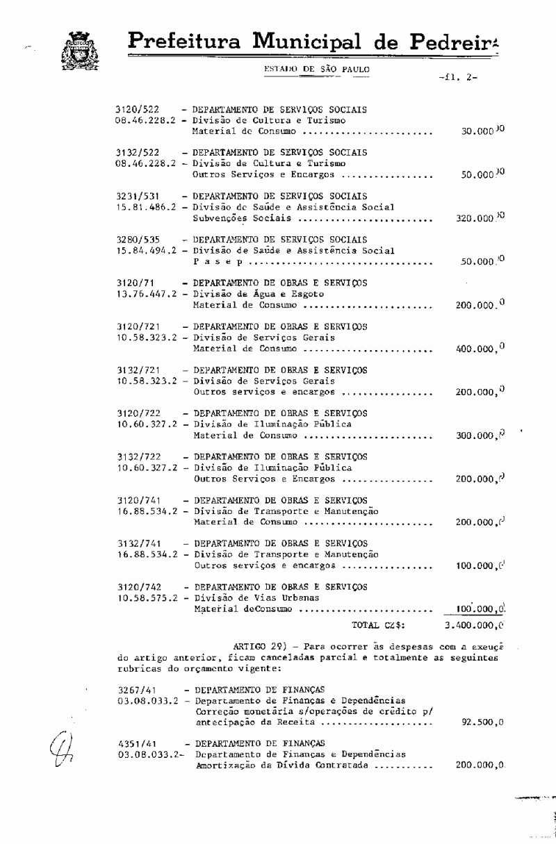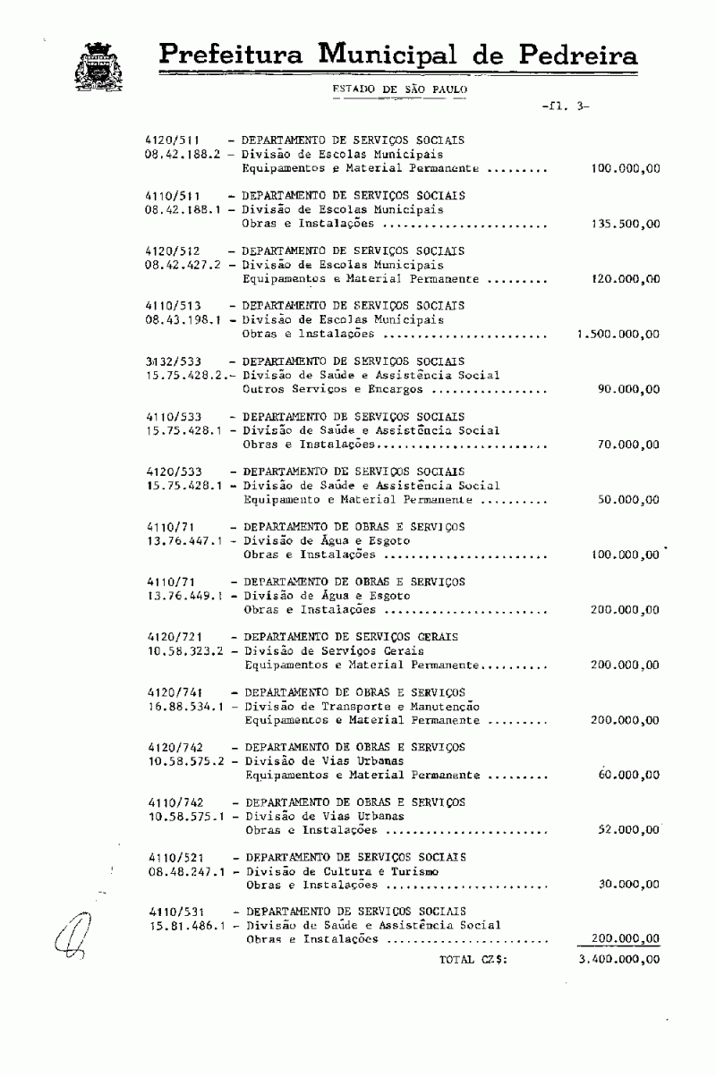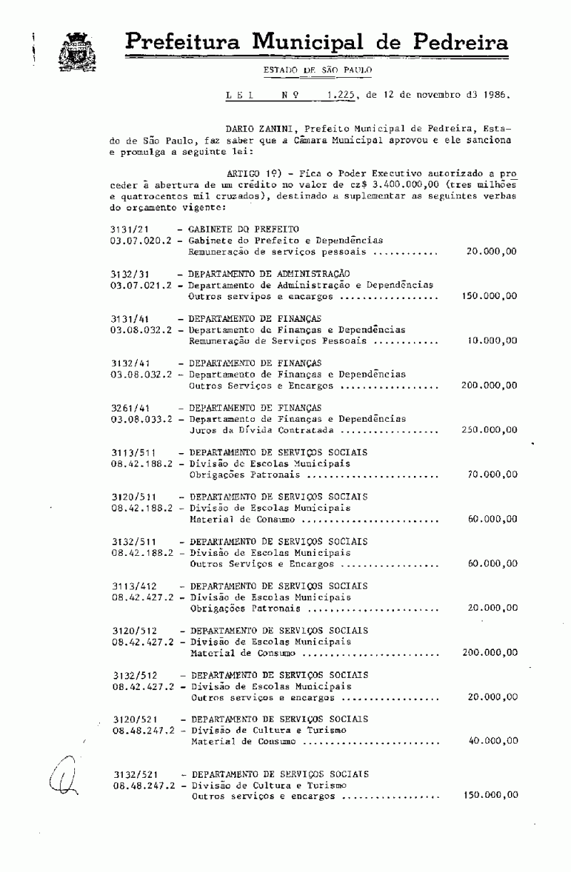 Ementa: Artigo 1º - Fica o Poder Executivo autorizado a proceder à abertura de um crédito no valor de Cz$ 3.400.000,00 (três milhões e quatrocentos mil cruzados), destinado a suplementar as seguintes verbas do orçamento vigente.