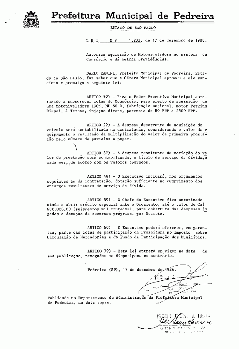 Lei Municipal - N° 1233 de 17/12/1986