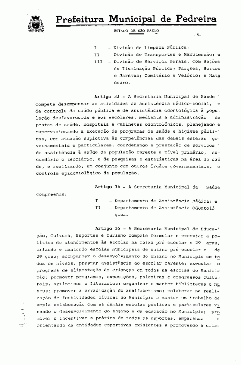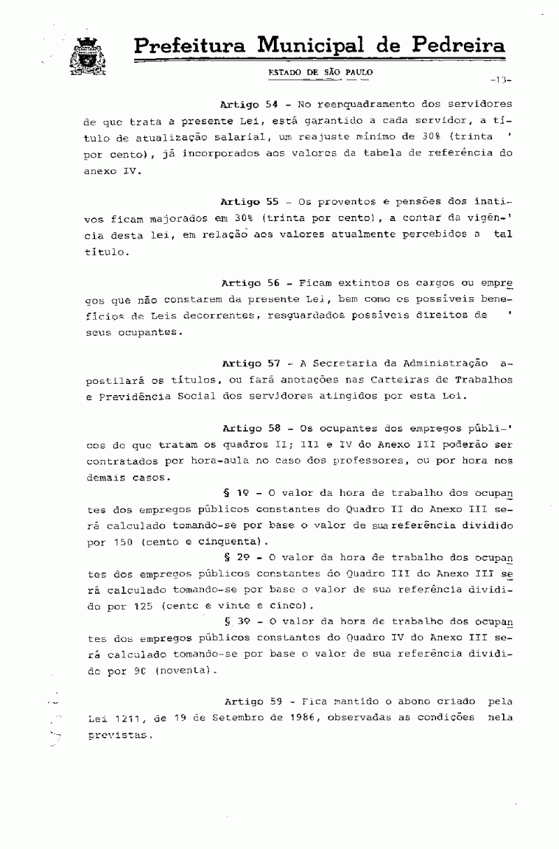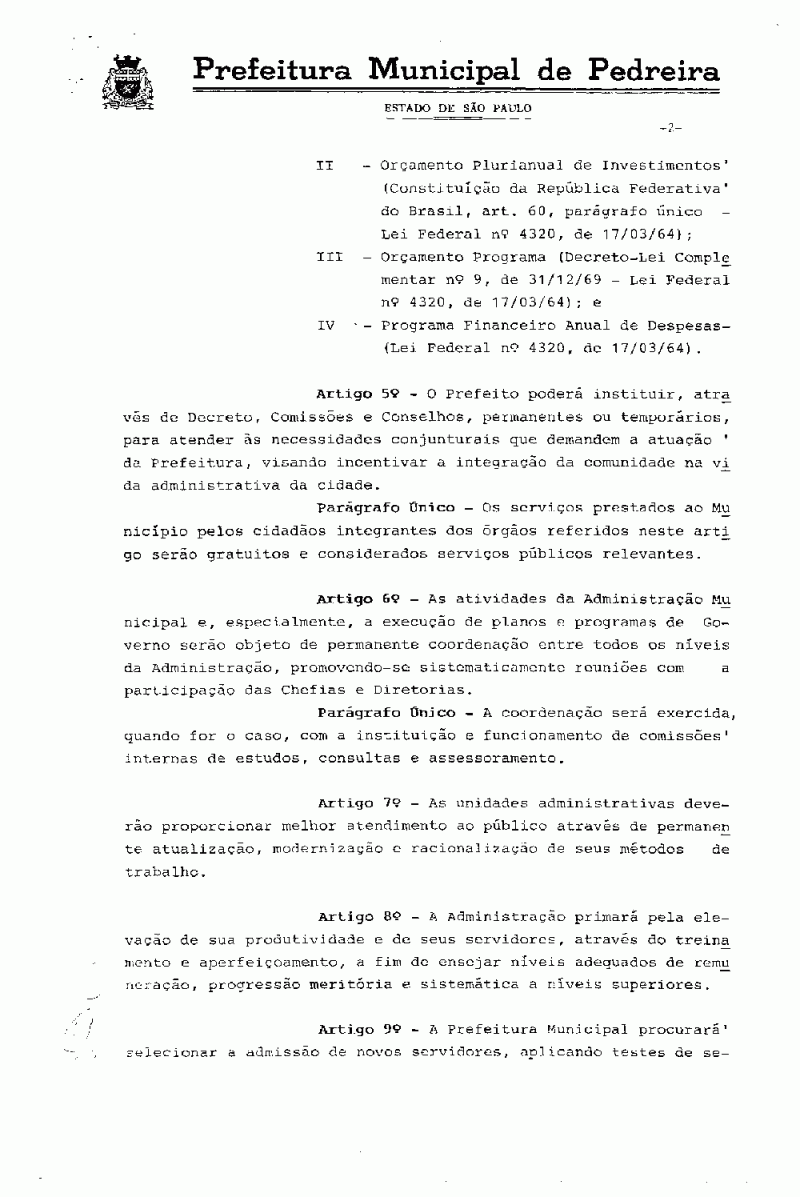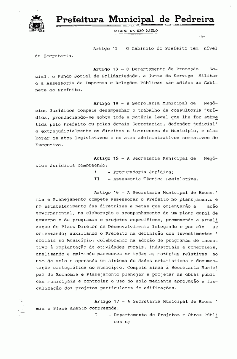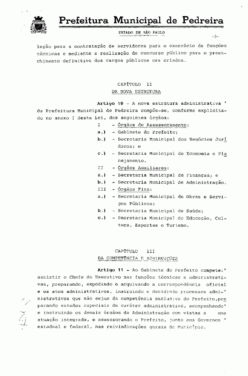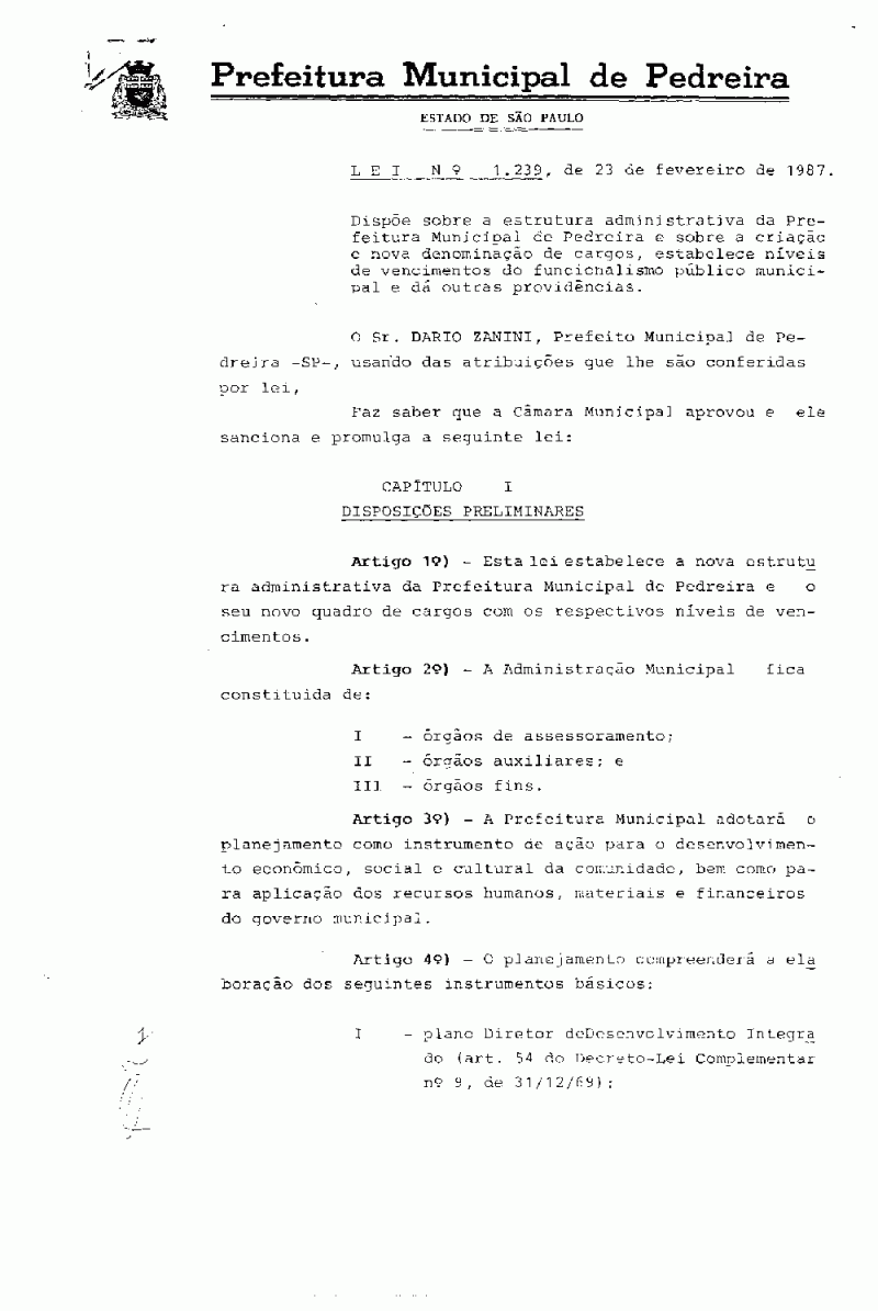 Ementa: Dispõe sobre a estrutura administrativa da Prefeitura Municipal de Pedreira e sobre a criação e nova denominação de cargos, estabelece níveis de vencimentos do funcionalismo público municipal e dá outras providências.