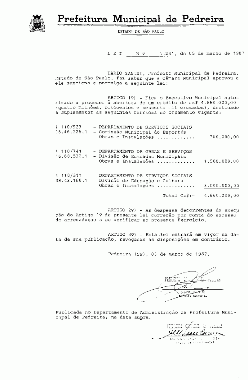 Ementa: Artigo 1º - Fica o Executivo Municipal autorizado a proceder à abertura de um crédito de Cz$ 4.860.000,00 (quatro milhões, oitocentos e sessenta mil cruzados), destinado a suplementar as seguintes rubricas do orçamento vigente.