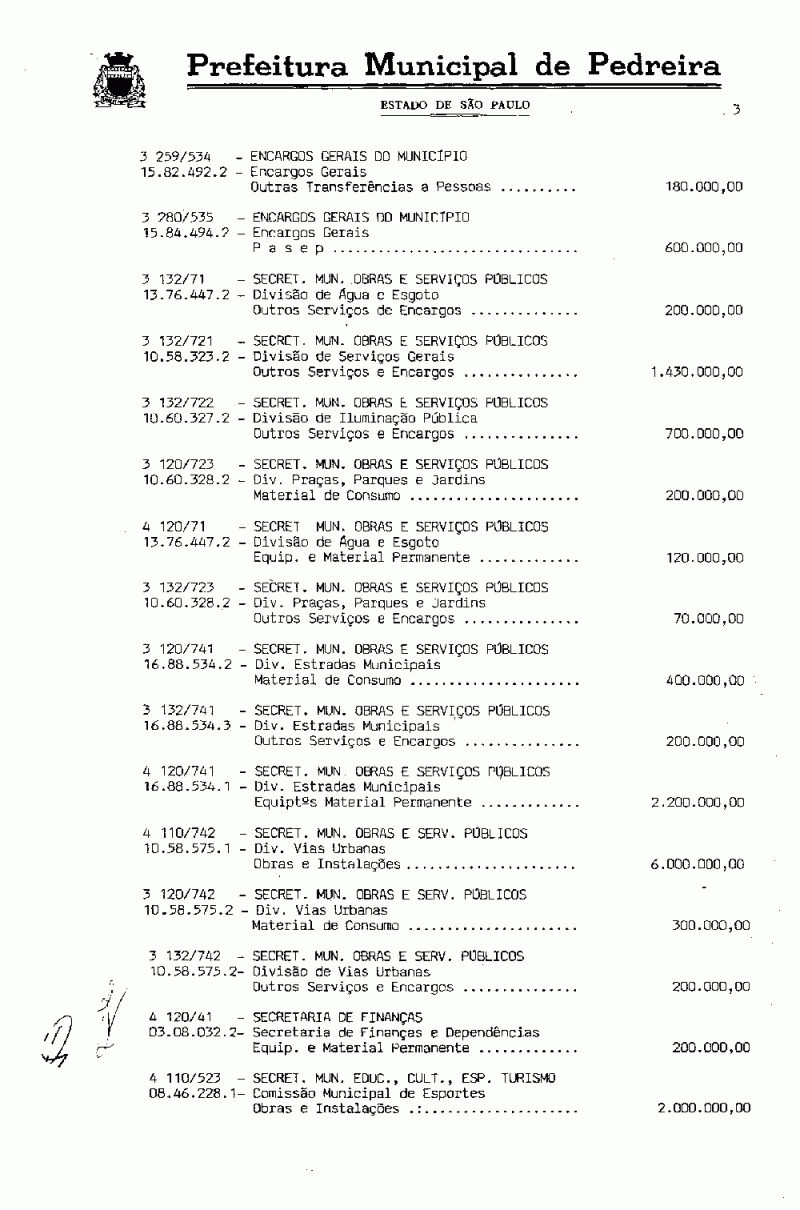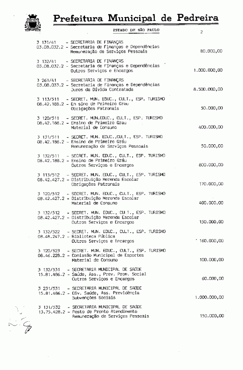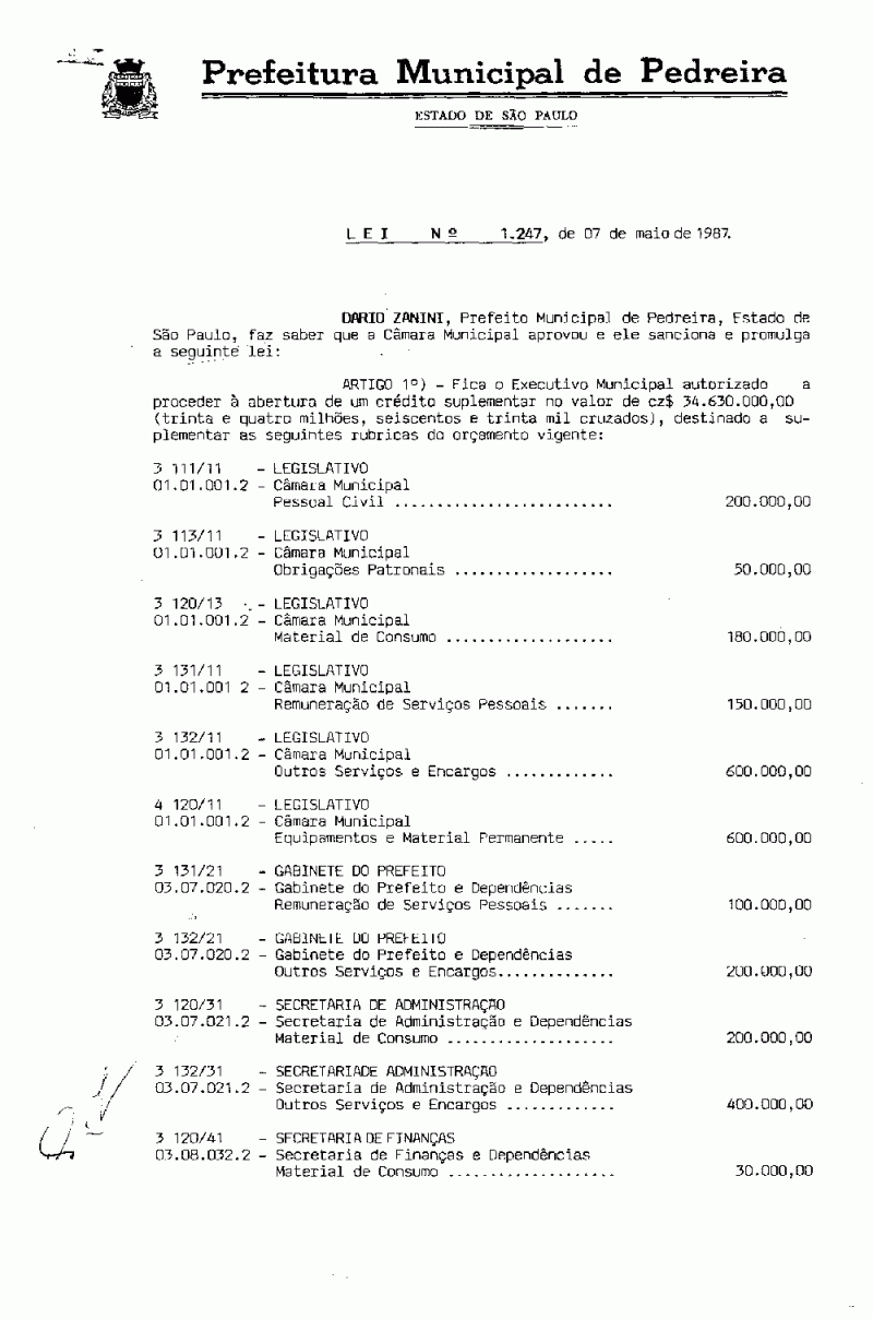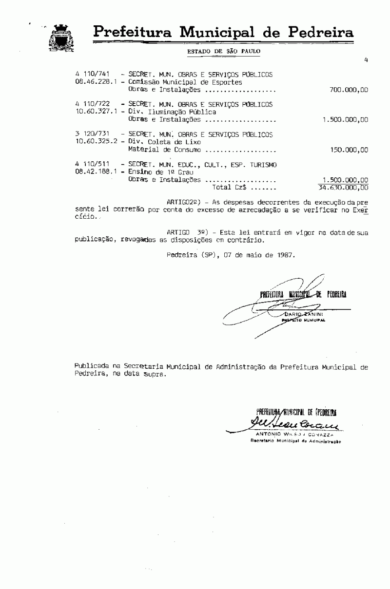 Ementa: Artigo 1º - Fica o Executivo Municipal autorizado a proceder à abertura de um crédito suplementar no valor de Cz$ 34.630.000,00 (trinta e quatro milhões, seiscentos e trinta mil cruzados), destinado a suplementar as seguintes rubricas do orçamento vigente.