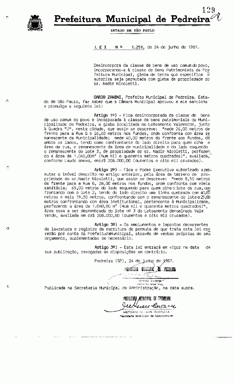 Ementa: Desincorpora da classe de bens de uso comum do povo, incorporando-se à Classe de Bens Patrimoniais da Prefeitura Municipal, gleba de terra que especifica e autoriza seja permutada com gleba de propriedade do sr. Nadir Nicoletti.