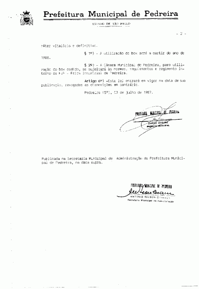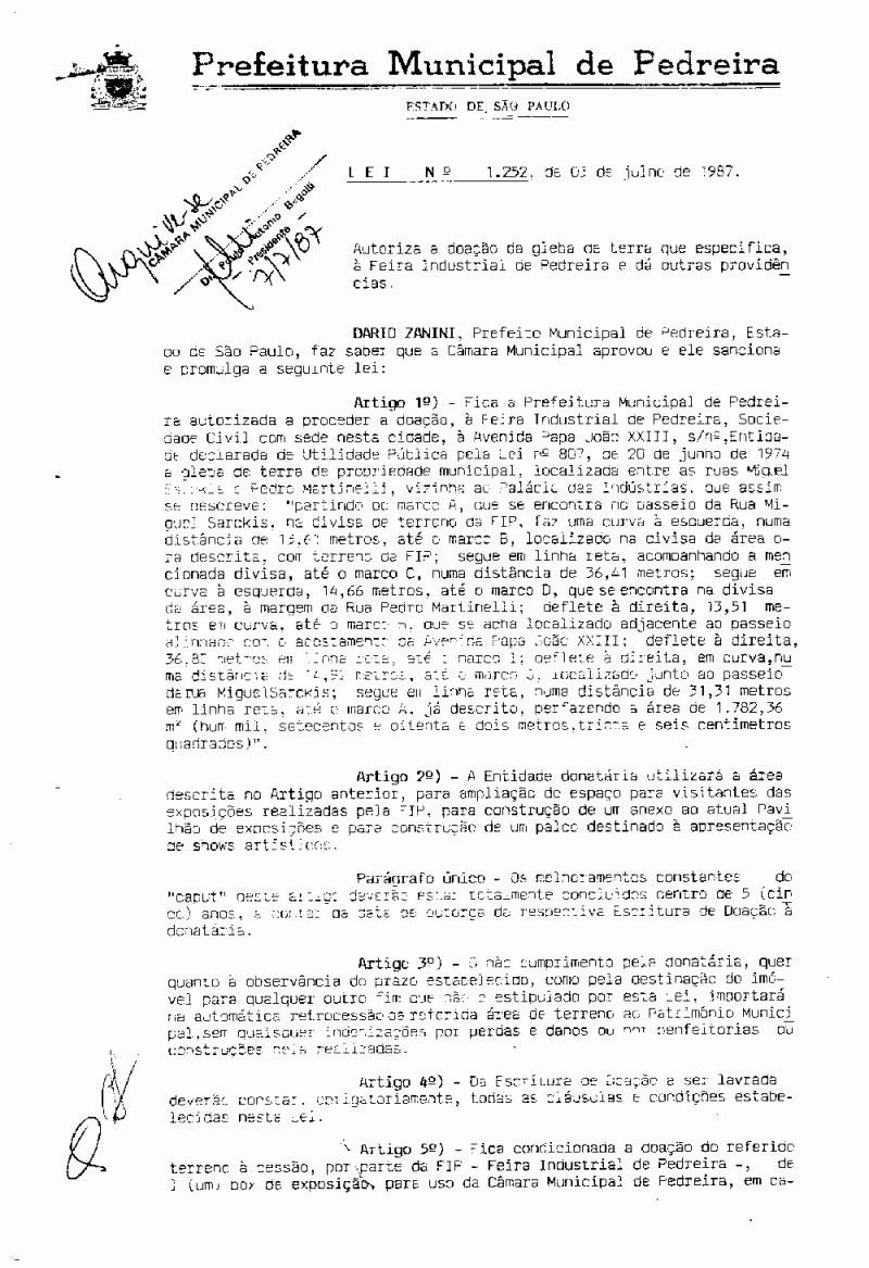 Ementa: Autoriza a doação de gleba de terra que especifica, à Feira Industrial de Pedreira e dá outras providências.