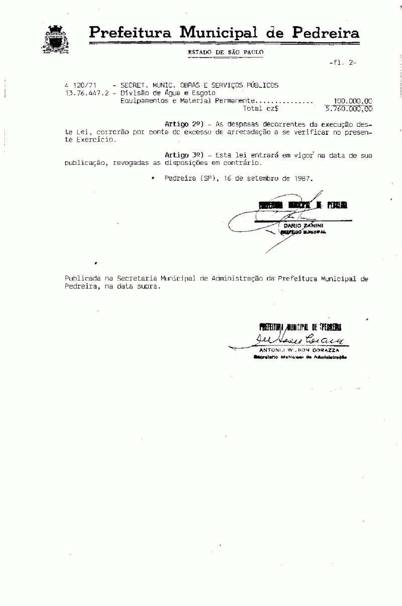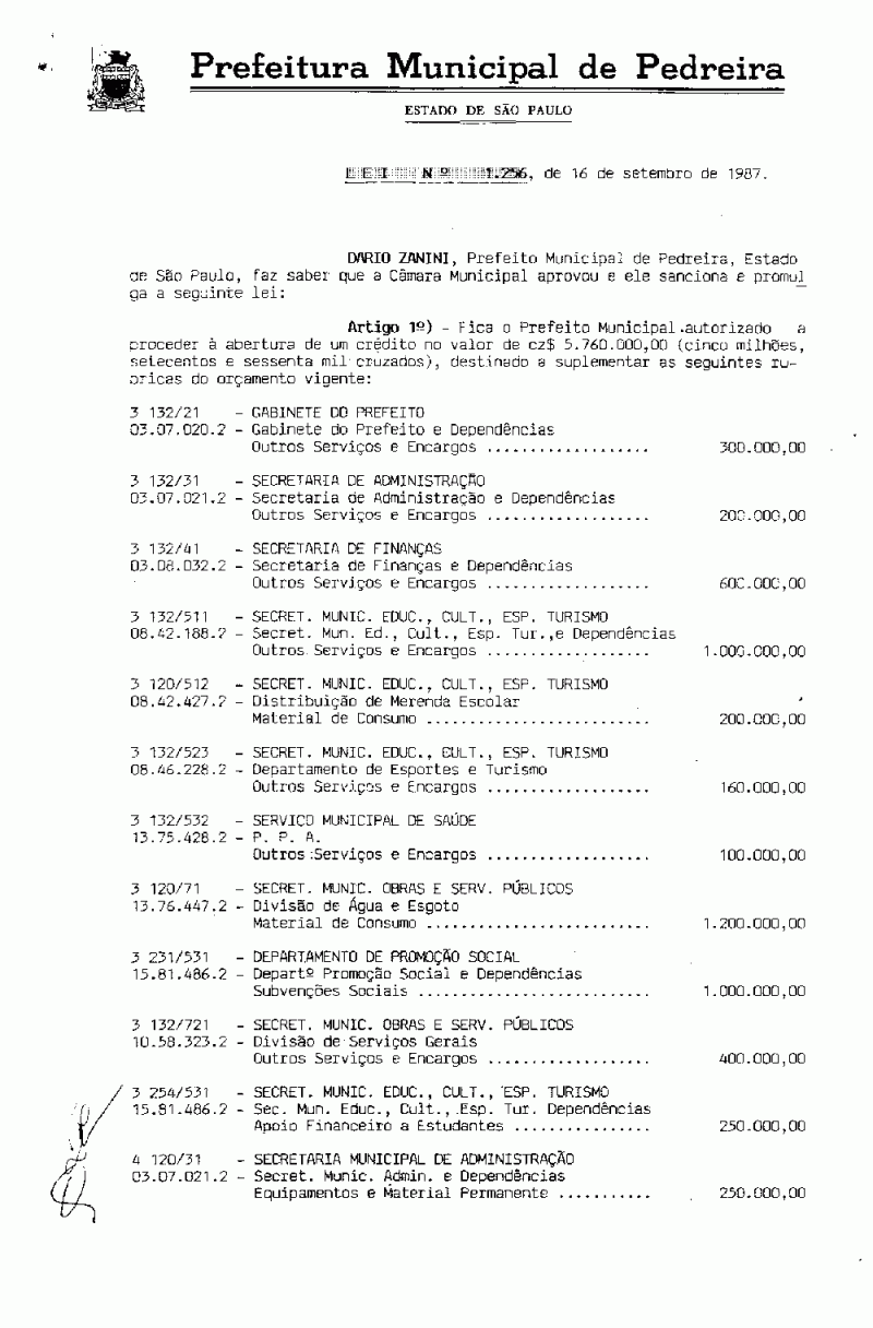 Ementa: Artigo 1º - Fica o Prefeito Municipal autorizado a proceder à abertura de um crédito no valor de Cz$ 5.760.000,00 (cinco milhões, setecentos e sessenta mil cruzados), destinado a suplementar as seguintes rubricas do orçamento vigente.
