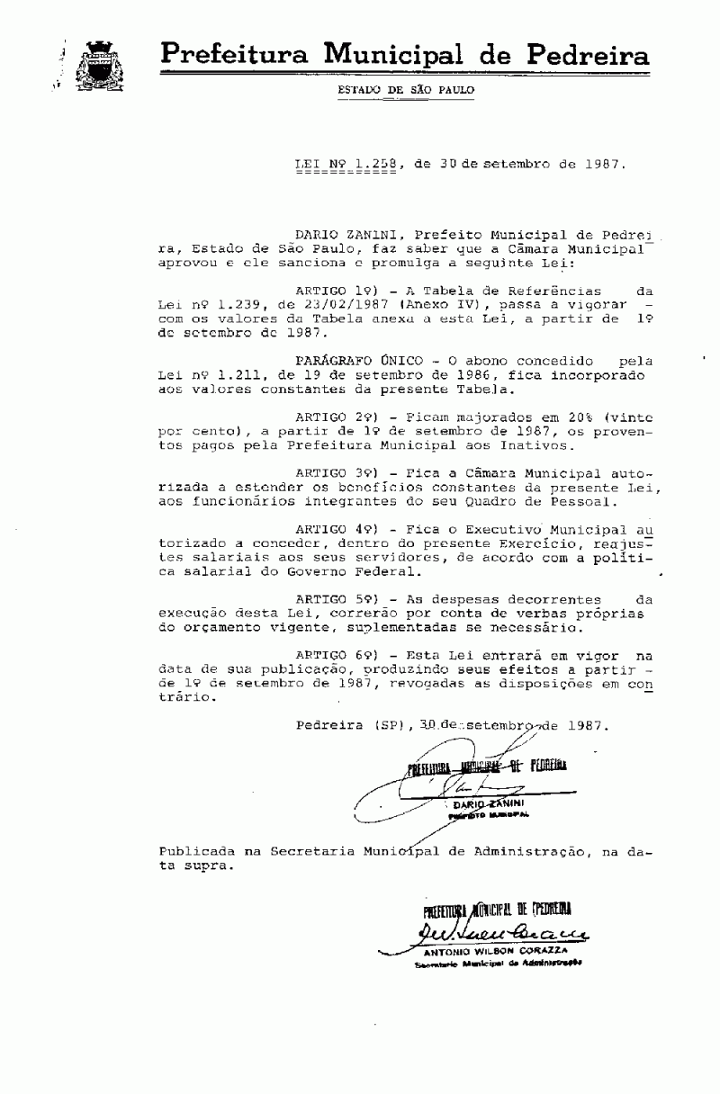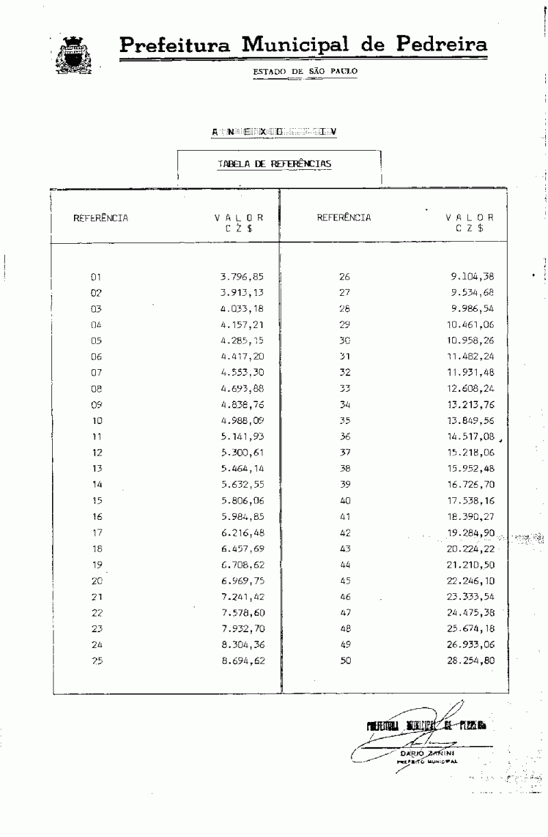 Ementa: Artigo 1º - A tabela de referência da Lei nº 1239, de 23/02/1987 (Anexo IV), passa a vigorar com os valores da Tabela anexa a esta lei, a partir de 1º de setembro de 1987.