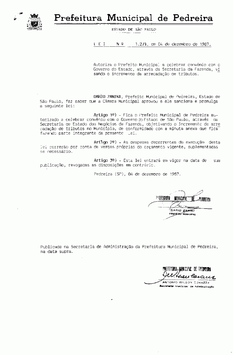 Ementa: Autoriza o Prefeito Municipal a celebrar convênio com o Governo do Estado, através da Secretaria da Fazenda, visando o incremento da arrecadação de tributos.