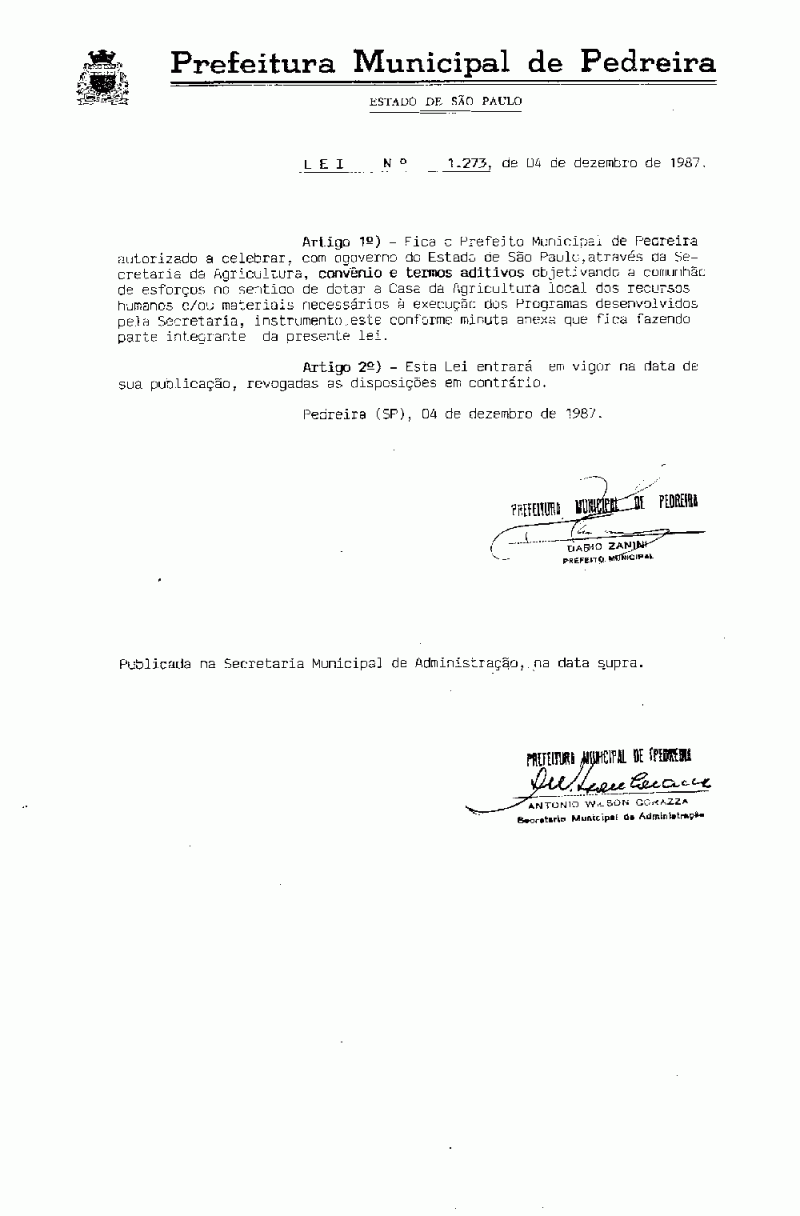 Lei Municipal - N° 1273 de 04/12/1987