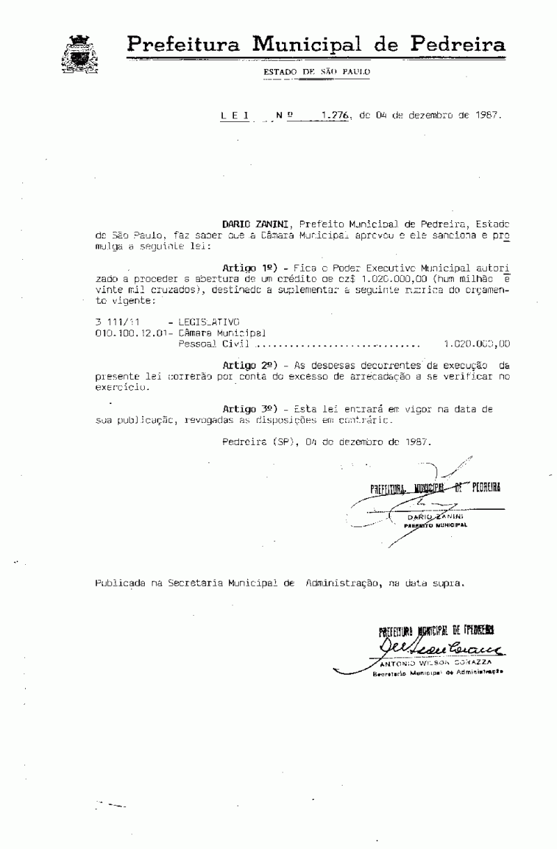 Ementa: Artigo 1º - Fica o Poder Executivo Municipal autorizado a proceder a abertura de um crédito de Cz$ 1.020.000,00 (hum milhão e vinte mil cruzados), destinado a suplementar a seguinte rubrica do orçamento vigente.