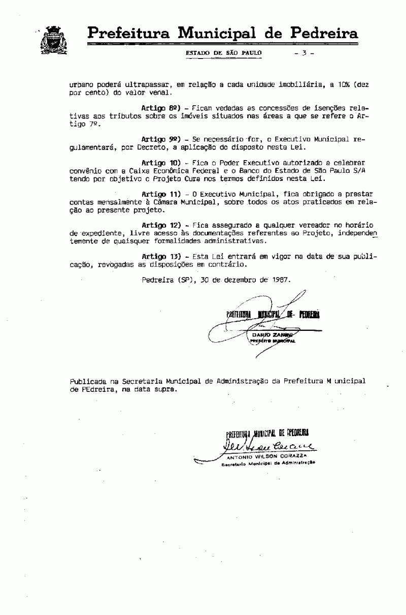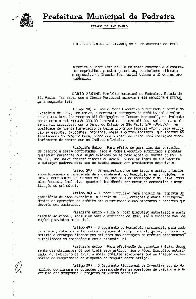 Ementa: Autoriza o Poder Executivo a celebrar convênio e a contratar empréstimo, prestar garantias, estabelecer alíquota progressiva no Imposto Territorial Urbano e dá outras providências.