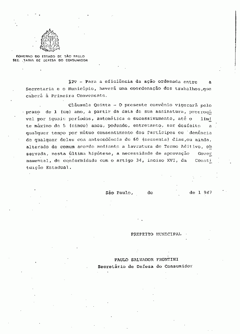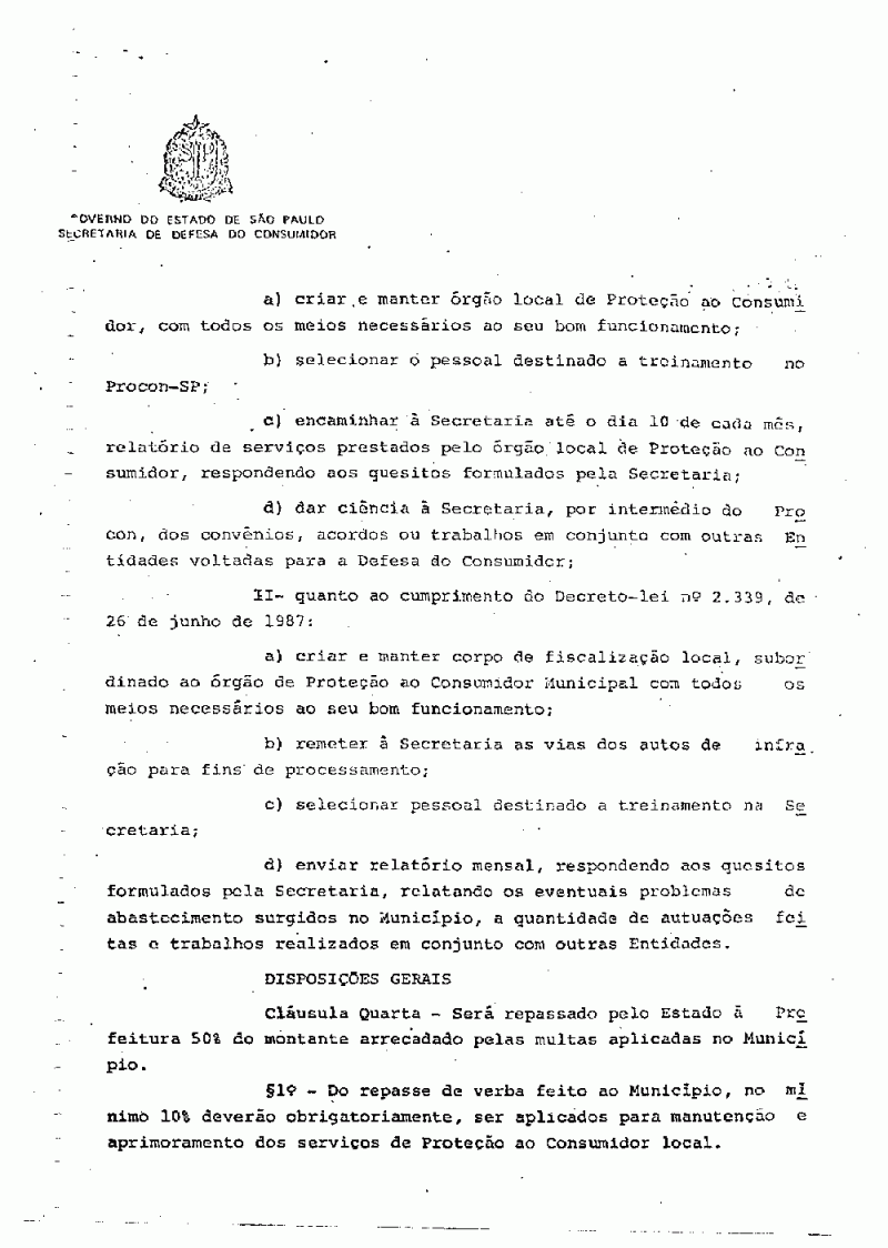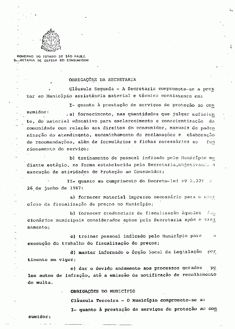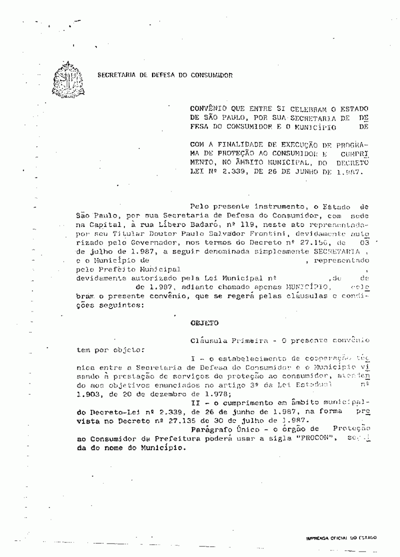 Ementa: Dispõe sobre a realização de convênio com a Secretaria de Defesa do Consumidor com a finalidade de execução do Programa de Proteção ao Consumidor e cumprimento no âmbito municipal, do Decreto Lei nº 2339, de 26 de junho de 1987.