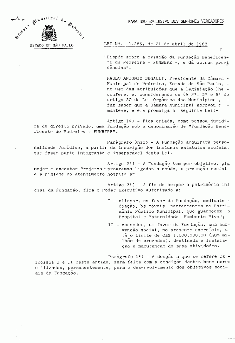 Lei Municipal - N° 1286 de 21/04/1988