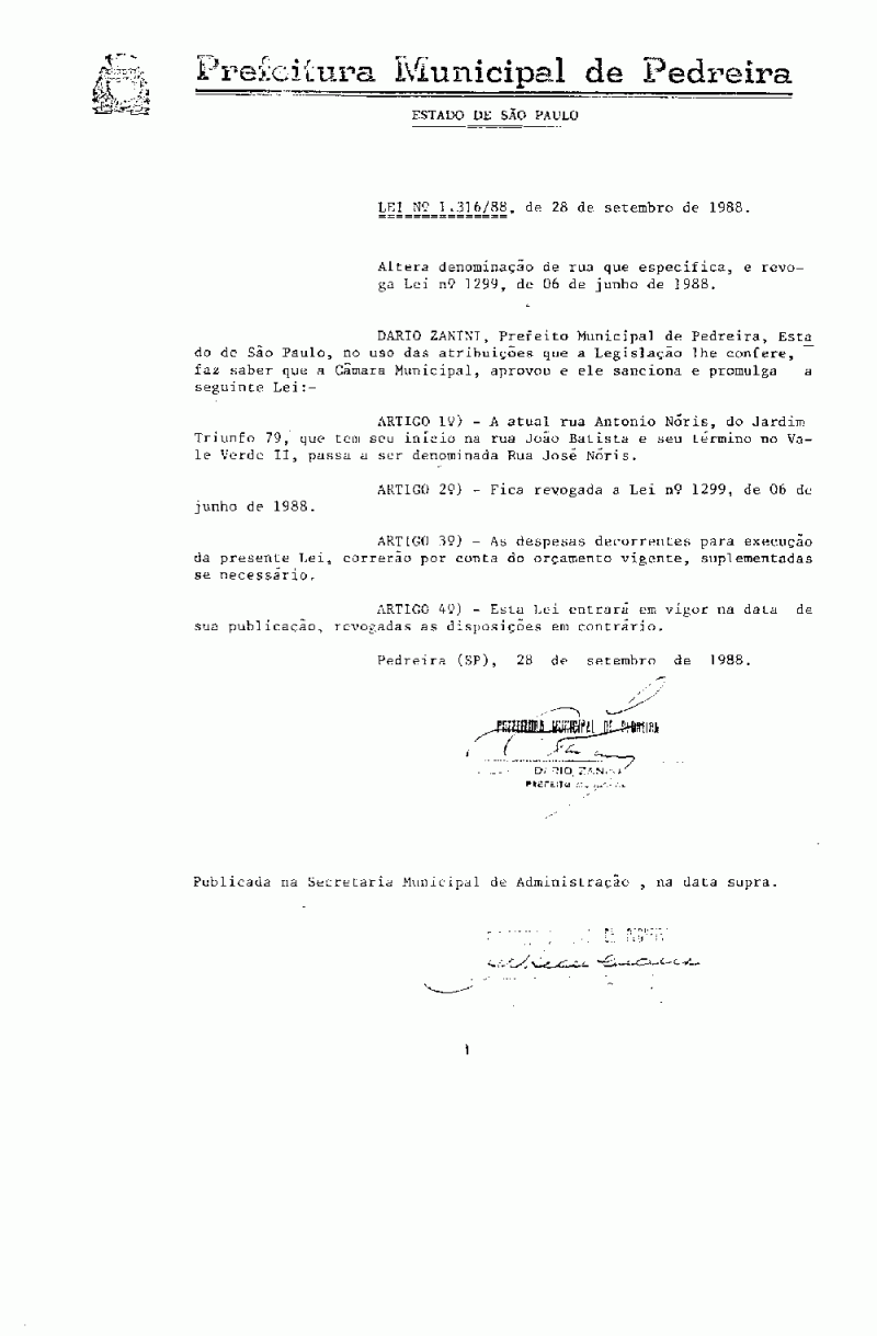 Lei Municipal - N° 1316 de 28/09/1988