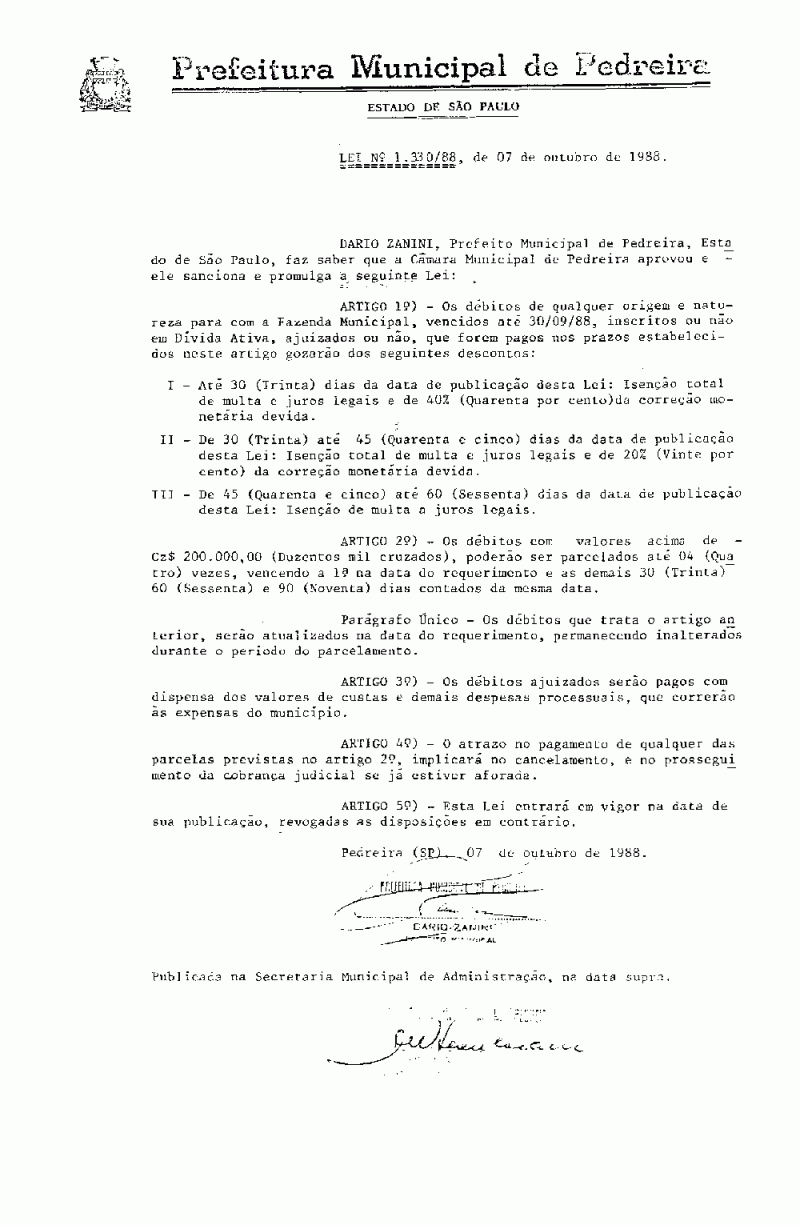 Ementa: Artigo 1º - Os débitos de qualquer origem e natureza para com a Fazenda Municipal, vencidos até 30/09/88, inscritos ou não em dívida ativa, ajuizados ou não, que forem pagos nos prazos estabelecidos neste artigo gozarão dos seguintes descontos.