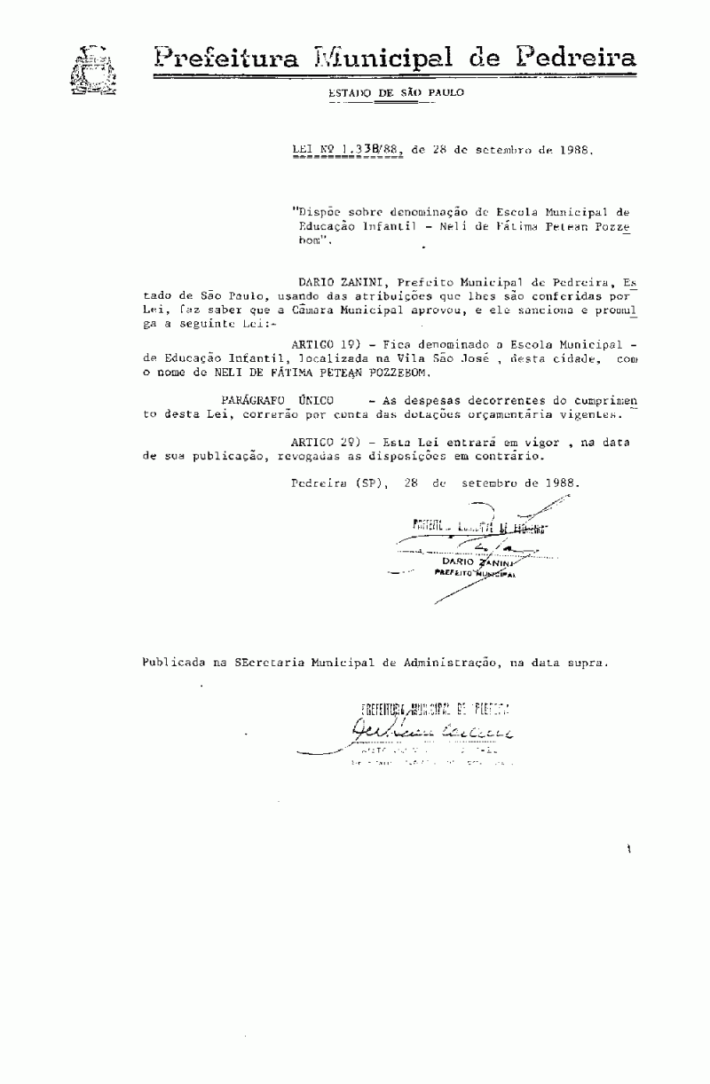 Ementa: Dispõe sobre denominação de Escola Municipal de Educação Infantil - Neli de Fátima Petean Pozzebom.
