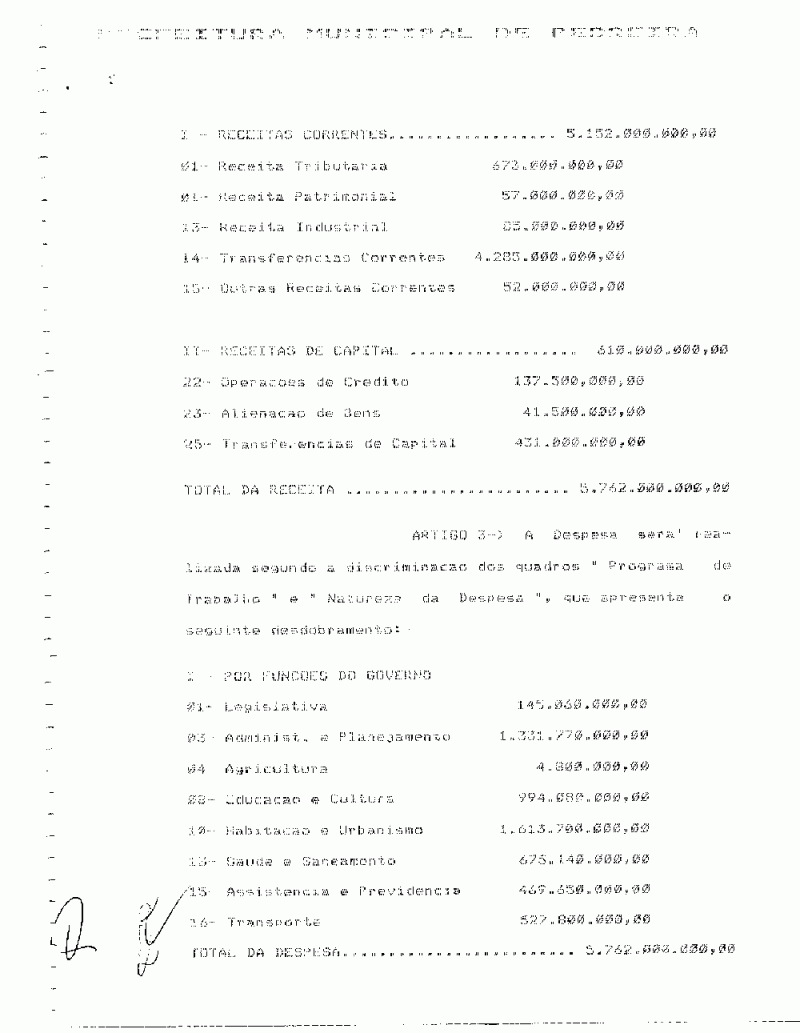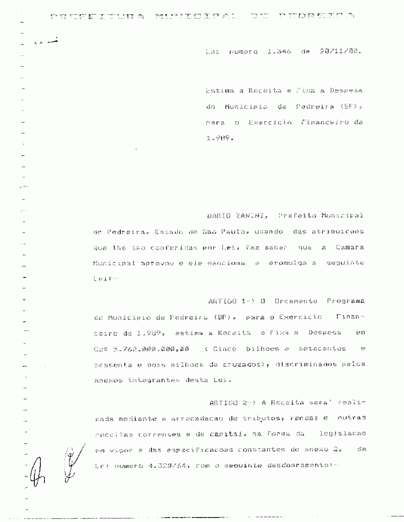 Ementa: Estima a Receita e fixa a Despesa do Município de Pedreira (SP), para o exercício financeiro de 1989.