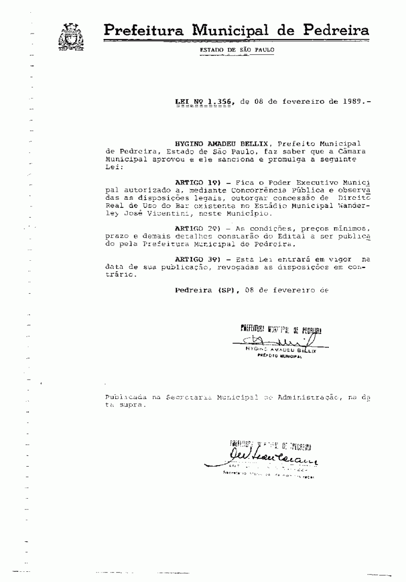 Ementa: Artigo 1º - Fica o Poder Executivo Municipal autorizado a, mediante Concorrência Pública e observadas as disposições legais, outorgar concessão de Direito Real de Uso do bar existente no Estádio Municipal Wanderley José Vicentini, neste Município.