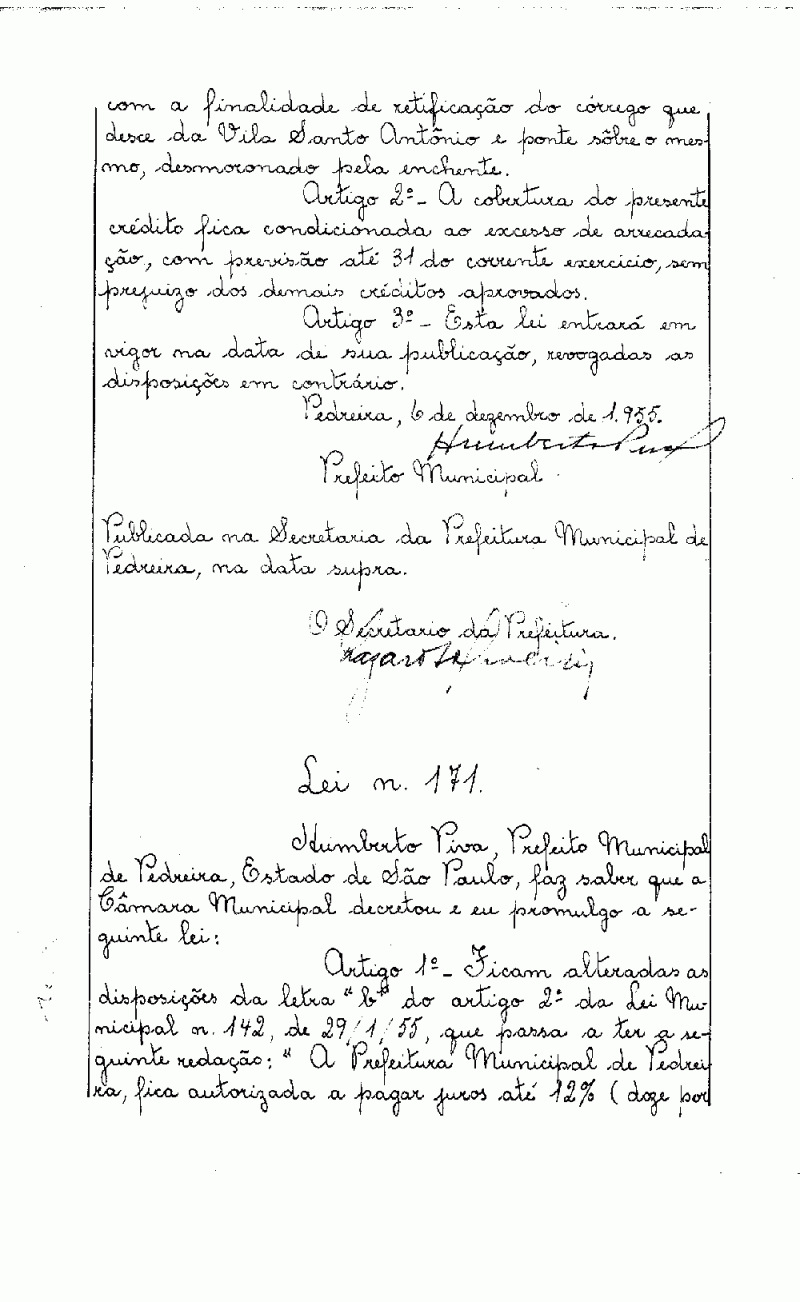 Ementa: Artigo 1º - Fica aberto na Contadoria Municipal, um crédito especial de Cr$ 25.000,00 (vinte e cinco mil cruzeiros) destinado ao pagamento do título a favor de Benedita Vergotti, emitido por esta Prefeitura, com vencimento para 30-11-55, correspondente a um terreno e prédio adquiridos com a finalidade de retificação do córrego que desce da Vila Santo Antonio e ponte sobre o mesmo, desmoronado pela enchente.