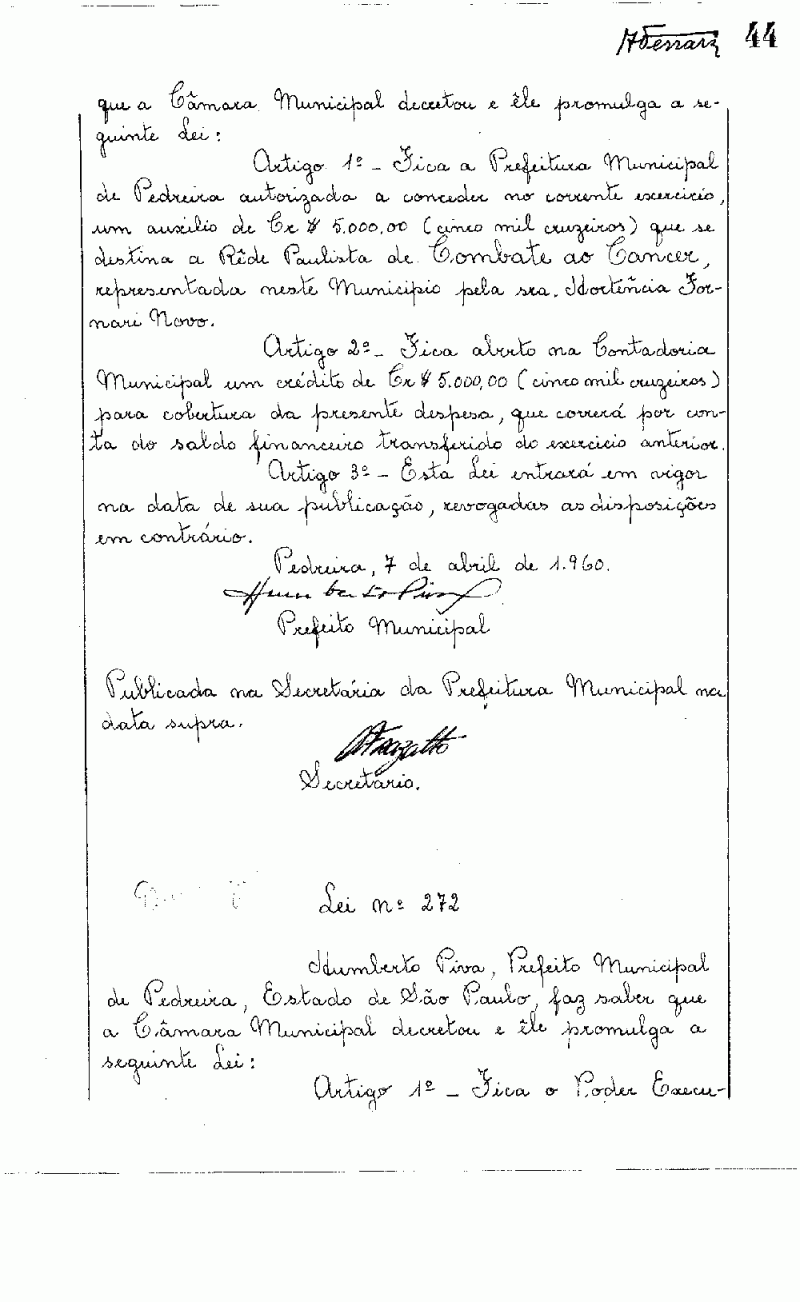 Ementa: Artigo 1º - Fica a Prefeitura Municipal de Pedreira autorizada a conceder no corrente exercício, um auxílio de Cr$ 5.000,00 (cinco mil cruzeiros) que se destina a Rede Paulista de Combate ao Câncer, representada neste Município pela sra. Hortência Fornari Novo.