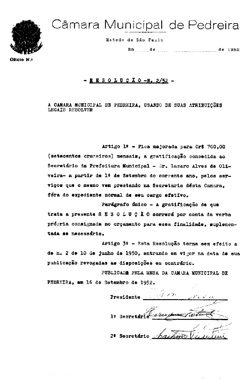 Ementa: Artigo 1° - Fica majorada para Cr$ 700,00 (setecentos cruzeiros) mensais, a gratificação concedida ao Secretário da Prefeitura Municipal - Sr. Lazaro Alves de Oliveira - a partir de 1° de setembro do concorrente ano, pelos serviços que o mesmo vem prestando na Secretária desta Câmara, fora do expediente normal de seu cargo efetivo.