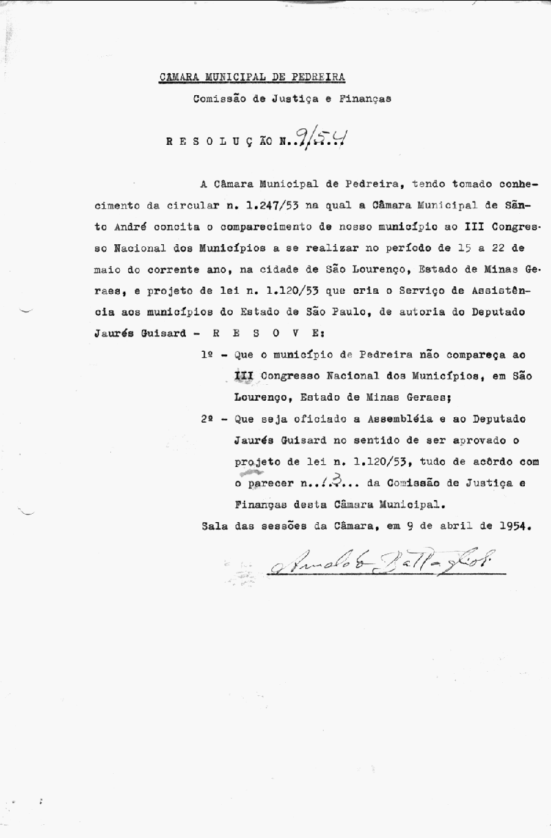 Ementa: A Câmara Municipal de Pedreira, tendo tomado conhecimento da circular n° 1.247/53 na qual a Câmara Municipal de Santo André concita o comparecimento de novo município ao III Congresso Nacional dos Municípios a se realizar ao período de 15 a 22 de maio do corrente ano, na cidade de São Lourenço, Estado de Minas Gerais, e projeto de Lei n° 1.120/53 que cria o serviço de Assistência aos Municípios do Estado de São Paulo, de autoria do Deputado Jaurés Guisard - Resolve: