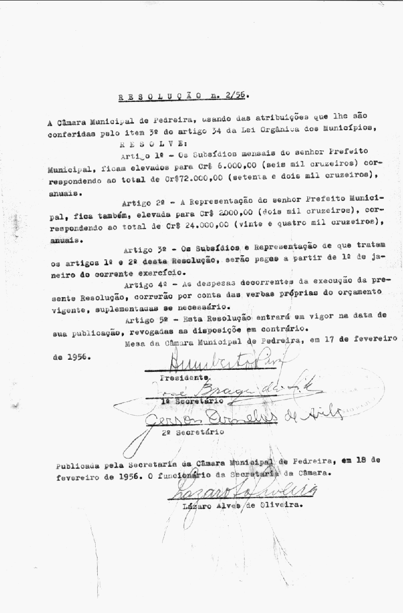 Ementa: Artigo 1° - Os Subsídios mensais do senhor Prefeito Municipal, ficam elevados para Cr$ 6.000,00 (seis mil cruzeiros) correspondendo ao total de Cr$ 72.000,00 (setenta e dois mil cruzeiros), anuais.