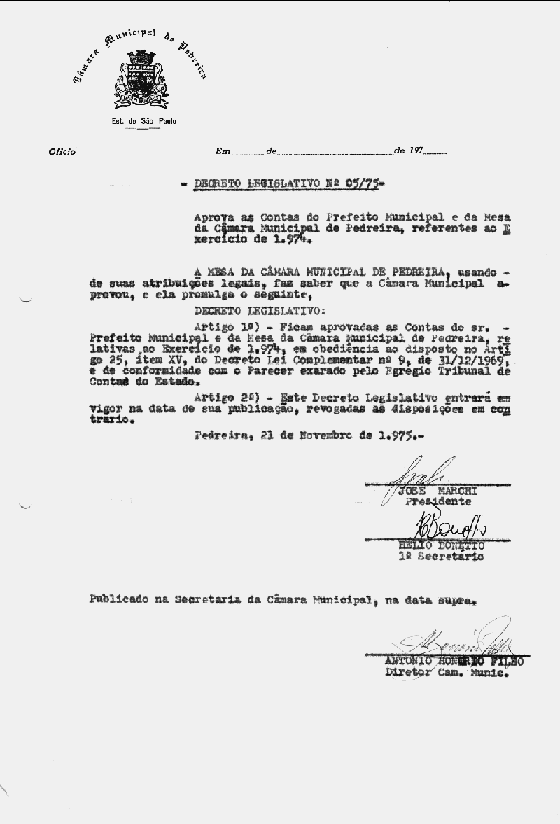 Ementa: Aprova as contas do Prefeito Municipal e da Mesa da Câmara Municipal de pedreira, referente as Exercício de 1974