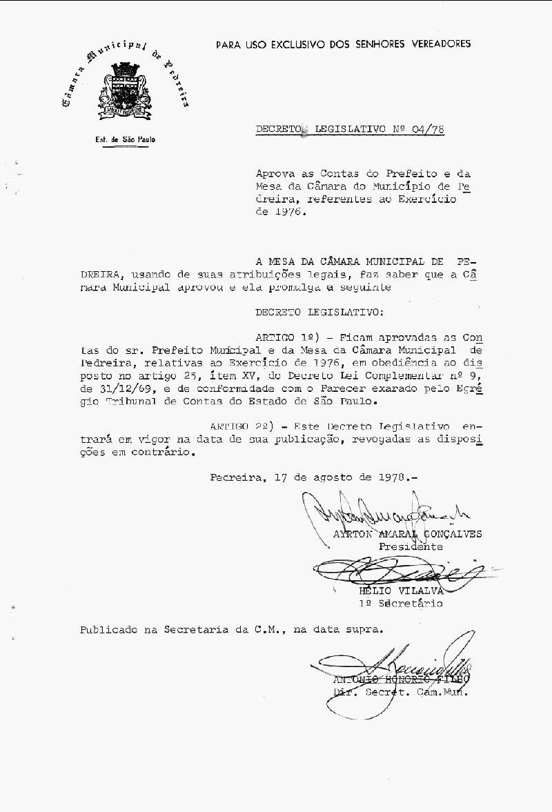 Ementa: Aprova as Contas do Prefeito e da Mesa da Câmara do Município de Pedreira, referentes ao Exercício de 1976