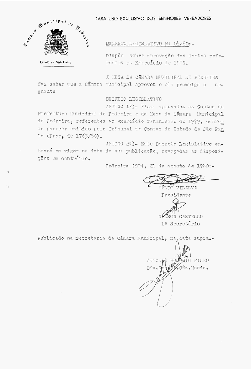 Ementa: Dispõe sobre aprovação das Contas referentes ao Exercício de 1979
