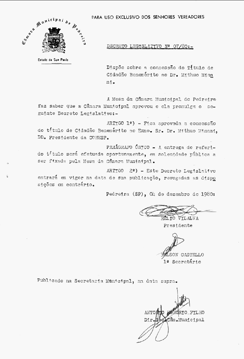 Ementa: Dispõe s/ concessão de título de cidadão Benemérito ao Dr. Mithuo Minami