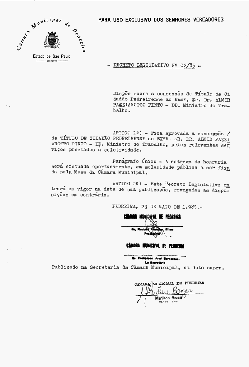 Ementa: Dispõe sobre a concessão de Título de Cidadão Pedreirense ao Exm°. Sr. Dr. Almir Pazzianotto Pinto - DD. Ministro do Trabalho.