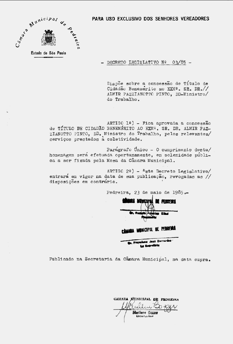 Ementa: Dispõe sobre a concessão de Título de Cidadão Benemérito ao Exm°. Sr. Dr. Almir Pazzianotto Pinto - DD. Ministro do Trabalho.