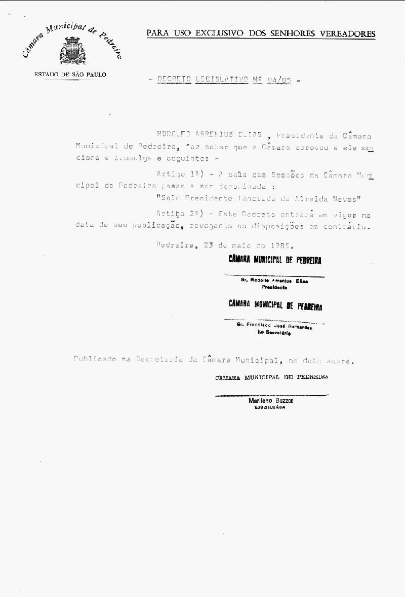 Ementa: Artigo 1° - A sala das Sessões da Câmara Municipal de Pedreira passa a ser denominada "Sala Presidente Tancredo de Almeida Neves".