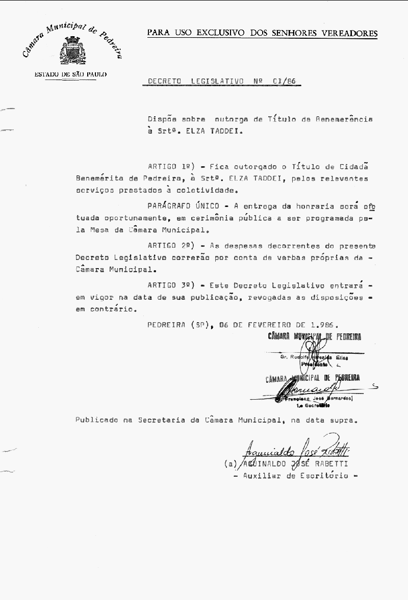 Ementa: Dispõe sobre outorga de Título de Benemerência à Srt°. Elza Taddei